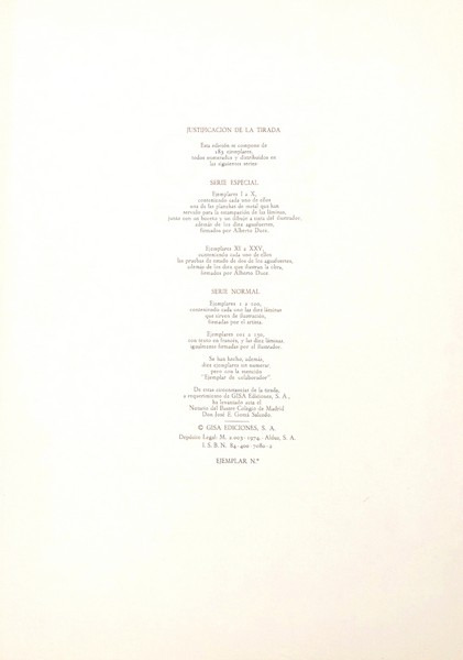 Madrid Gisa Ediciones (collection Torculum, n°1) 1974 In-f° (525 x 385 mm), 44 pp. - [2] ff. bl. - [10] pl., couverture muette, chemise titrée pour la suite de planches, étui éditeur de simili-cuir brun titré au plat supérieur et illustré de deux compositions sur les contreplats.