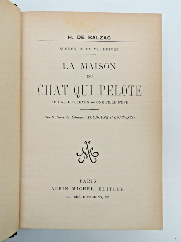 Un des 50 exemplaires sur papier ancien du Japon numérotés de 51 à 100 et paraphés par l'éditeur (n° 95), auquel on a joint dans chaque volume la suite des bois tirée sur papier de chine, texte revisé et annoté par Marcel Bouteron et Henri Longnon, gravés sur bois par Pierre Gusman, 40 vol. in-8 carré reliure de l'époque pleine basane marron, dos 4 nerfs dorés, têtes dorées, couvertures et dos conservés, Louis Conard, Paris, 1912-1940. Titre complet : Oeuvres complètes de Honoré de Balzac (40 Tomes : Complet) [ Exemplaire sur papier du Japon avec suite sur Chine ] [ Contient : ] La Comédie Humaine (33 Volumes) Etudes de Moeurs, Scènes de la Vie Privée. I : La Maison du chat-qui-pelote. Le Bal de Sceaux. Mémoires de deux jeunes mariés La Bours ; II : Modeste Mignon. Un début dans la Vie ; III : Albert Savarus. La Vendetta. Une Double Famille. La Paix du Ménage. Madame Firmiani. Etude de Femme ; IV : La fausse maîtresse. Une Fille d'Eve. Le message. La Grenadière. La femme abandonnée. Honorine ; V : Béatrix. Gobseck ; VI : La femme de trente ans. Le père Goriot ; VII : Le colonel Chabert. La messe de l'athée. L'interdiction. Le contrat de mariage. Autre Etude de femme ; Etudes de moeurs. Scènes de la Vie de Province VIII : Ursule Mirouët. Eugénie Grandet ; IX : Les Célibataires. Pierrette. le Curé de Tours. La Rabouilleuse ; X : L'Illustre Gaudissart. La muse du département. La Vieille Fille ; XI : Le Cabinet des Antiques. Illusions perdues : Les Deux poëtes ; XII : Illusions perdues : Un grand homme de Province à Paris. Les Souffrances de l'Inventeur ; XIII : Scènes de la Vie Parisienne : Histoire des Treize. Ferragus. La Duchesse de Langeais. La fille aux yeux d'or ; XIV : Grandeur et décadence de César Birotteau. La maison Nuncingen ; XV : Splendeurs et misères des courtisanes I ; XVI : Splendeurs et misères des courtisanes II Les secrets de la Princesse de Cardigan. Facino Cane. Sarrasine. Pierre Grassou ; XVII : La Cousine Bette ; XVIII : Le Cousin Pons. Un prince de la Bohême. Un homme d'affaires ; XIX : Gaudissart II. Les comédiens sans le savoir ; XX : Les petits bourgeois. L'envers de l'histoire contemporaine ; XXI : Scènes de la vie politique. Un Episode sous la Terreur. Une ténébreuse affaire. Le député d'Arcis. Z. Marcas ; XXII : Scènes de la Vie Militaire : Les Chouans. Une Passions dans le Désert ; XXIII : Scènes de la Vie de Campagne : Les Paysans ; XXIV : Le médecin de campagne ; XXV : Le curé de village ; XXVI : Le Lys dans la vallée ; XXVII : Etudes philosophiques : La peau de chagrin. Jésus-Christ en Flandre. Melmoth réconcilié. Massimila Doni ; XXVIII : Le chef-d'oeuvre inconnu. Gambara. La recherche de l'absolu. L'enfant maudit ; XXIX : Adieu. Les Marana. Le réquisitionnaire. El Verdugo. Un drame au bord de la mer. Maître Cornélius. L'auberge rouge ; XXX : Sur Catherine de Medicis. L'élixir de longue vie ; XXXI : Les proscrits. Louis Lambert. Séraphita ; XXXII : Etudes analytiques : Physiologie du mariage ou méditation de philosophie éclectique sur le bonheur et le malheur conjugal ; XXXIII : Petites misères de la vie conjugale ; XXXIV : Théâtre I : Vautrin. Les ressources de Quinola. Paméla Giraud ; XXXV : Théâtre II : La Marâtre. Le faiseur. L'Ecole des Ménages ; XXXVI : Contes drôlatiques I : Premier et deuxième dixain ; XXXVII : Contes drôlatiques II : Troisième dixain. Fragments inédits ; XXXVIII : Oeuvres diverses I : 1824-1830 ; XXXIX : Oeuvres diverses II : 1830-1835 ; Oeuvres diverses III : 1836-1848