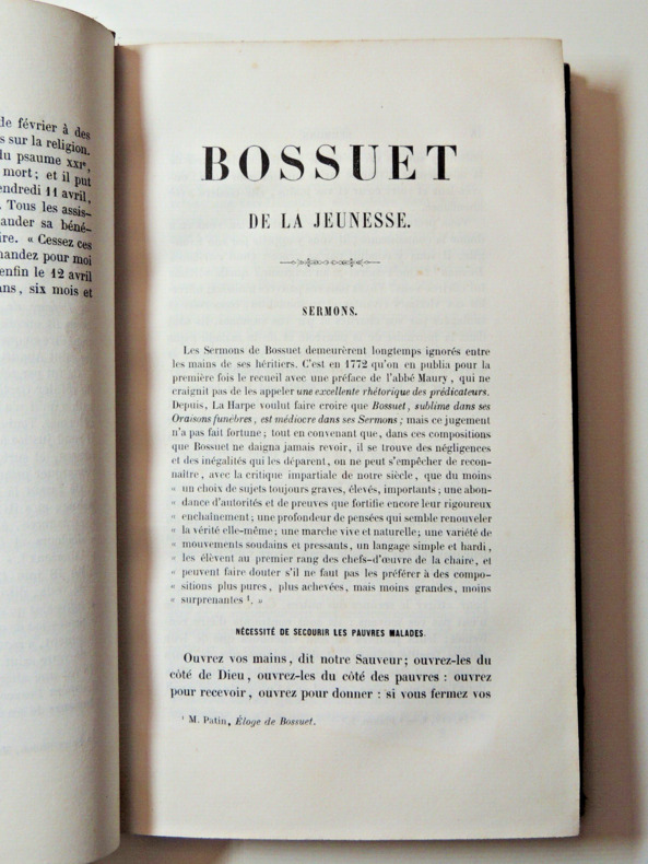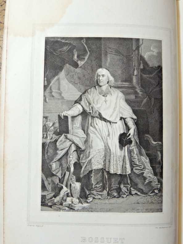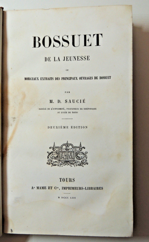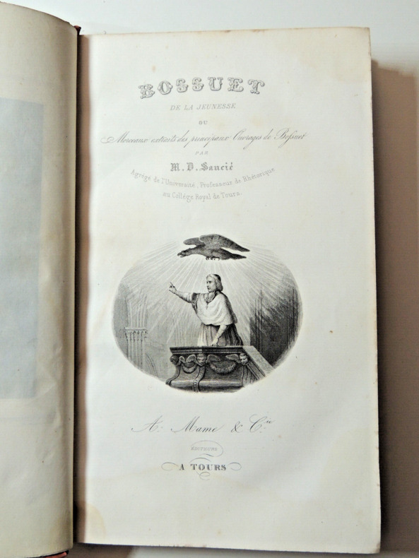 portrait de Bossuet en frontispice vol relié gd in-8, 220x130, jolie reliure demi cuir, tranches jaspées, petites traces de mouillures anciennes, 371pp, bon état, livre de prix. Paris Tours, Mame 1853 ref/81