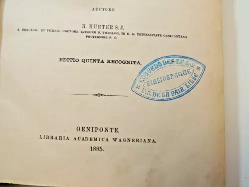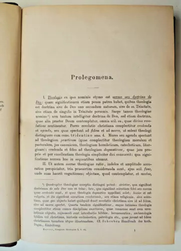 "Theologia Generalis" de H. Hurter S.J. est une œuvre qui explore les fondements de la théologie chrétienne à travers quatre grandes disputations. Elle examine d'abord la nature de Dieu, soulignant son existence, ses attributs et sa relation avec le monde. La deuxième disputation aborde la création, mettant en lumière le lien entre Dieu et l'univers. La troisième partie traite de la révélation divine, expliquant comment Dieu se manifeste à l'humanité, notamment à travers les Écritures et la Tradition. Enfin, la dernière disputation se concentre sur la théologie morale, interrogeant les principes éthiques issus de la foi chrétienne. L'œuvre propose ainsi une synthèse rigoureuse et systématique de la pensée théologique, visant à enrichir la compréhension de la foi chrétienne. Tome I & II, vols reliés, 235x165, reliés demi cuir, accrocs, frottements, coupures angulaires sur les pages de titre, 510 & 513pp Oeniponte 1885 ref/69