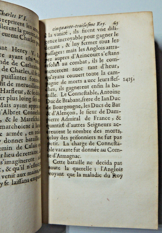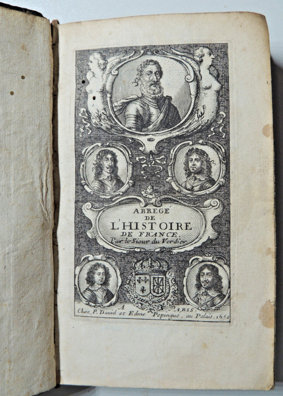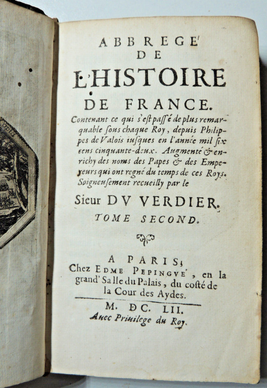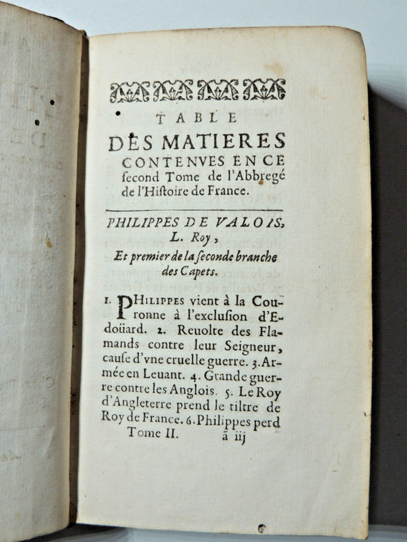 contenant ce qui s'est passé de plus remarquable sous chaque Roy, depuis Philippes de Valois jusqu'en 1652. Augmentée et enrichie des noms des papes & des empereurs qui ont regnés du temps de ces Roy, soigneusement receuilly. Tome II ( dernier), commençant à Philippe de Valoy à Louis XIV petit in12, 14,5x9cm, relié basane époque, accrocs et manque, corps solide, bien frais, 472pp. Ex libris M. Brochant du Breuil, Conseiller au Parlement. Paris, chez Edme Pepingue, 1652 ref/30