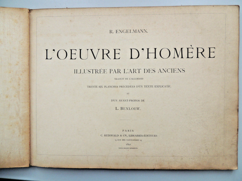 Nombreuses illustrations tirées d’œuvres d'art avec leurs explications. 36 planches précédées d'un texte explicatif et d'un avant propos de L. Benloew, non paginé, 60 pages et 212 dessins. Richard Engelmann (1844-1909) couverture cartonnée, avec usure d'usage, 26 cm x 34 cm, bel état intérieur. Paris, C. Reinwald & Cie 1891