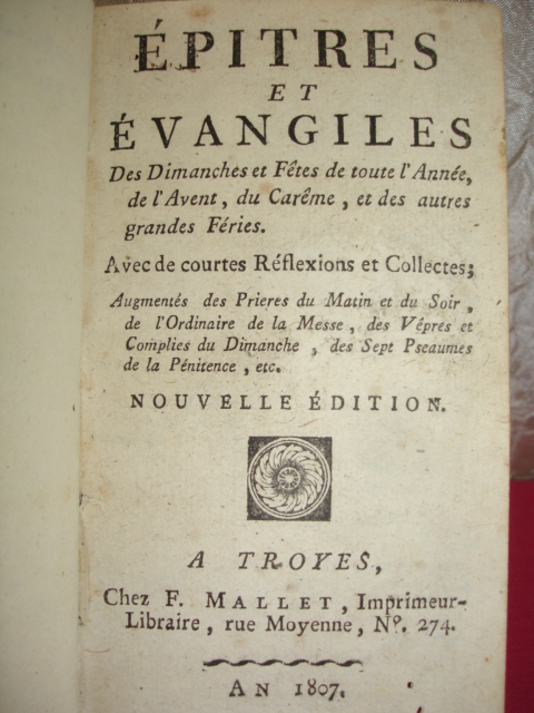 ÉPITRES et ÉVANGILES des dimanches et fêtes de toute l'année, de l'Avent, du Carême, et des autres grandes fêtes, avec de courtes réflexions, augmentées des Prières du Matin et du soir... Nouvelle édition volume in-12, 145x85, relié demi cuir, 672 pages , bon exemplaire A Troye An 1807