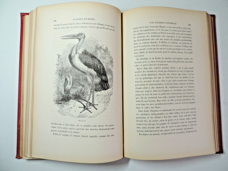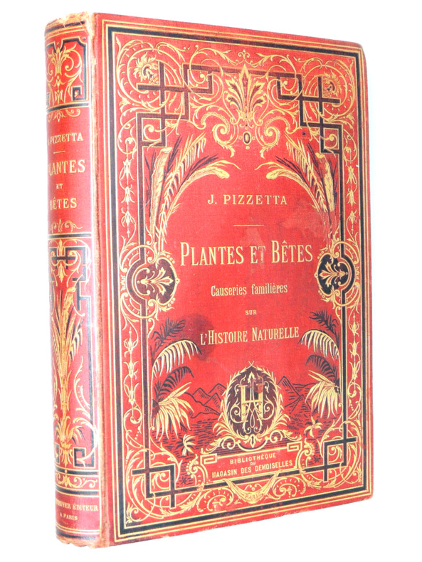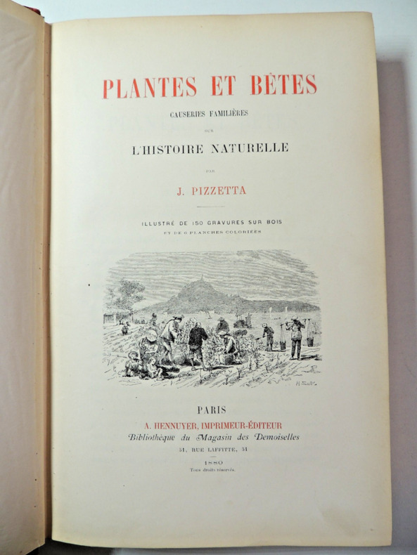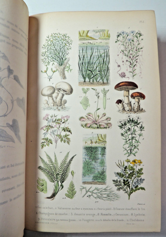 Paris A. Hennuyer Imprimeur-Éditeur 1895 In Quarto Demi maroquin bordeaux à 4 nerfs et 2 faux nerfs , ornés de caissons à fleurs de lys . 1° et 4° plat en percaline bordeaux . 3 Tranches dorées . Gardes blanches peignées fin , ton sur ton . Page de titre en deux couleurs . Ouvrage illustré de 150 gravures sur bois et de 6 planches lithographiées coloriées réhaussées d'argent , avec leur soie . En frontispice le Dr. Magnus et l'auteur . Les pages du premier feuillets comportent des traces de rousseurs . Le reste excellent . Sans date , dans les années 1895 . Un large tour d'horizon partant de Normandie , on visitera une serre tropicale , et tout ce qui se trouve dans les champs , jardin , bois et bord de mer comme plantes et animaux . - 448 p. , 1Kg 500 gr.