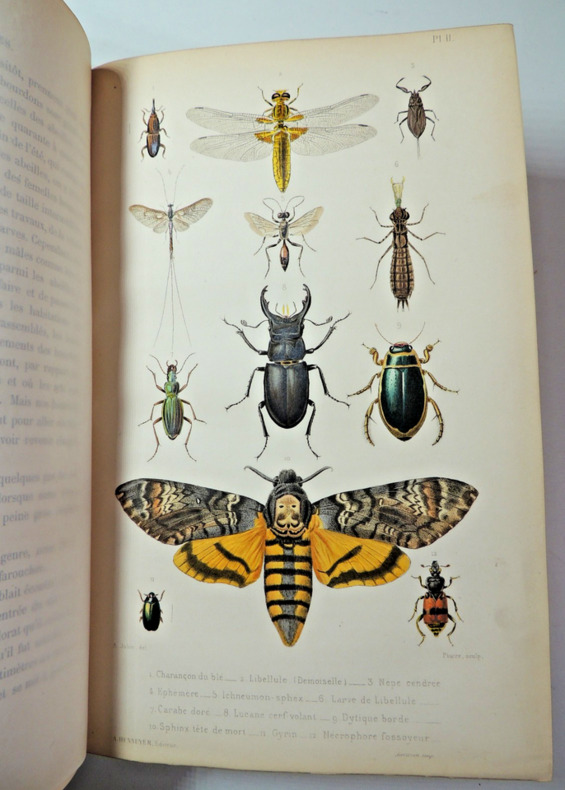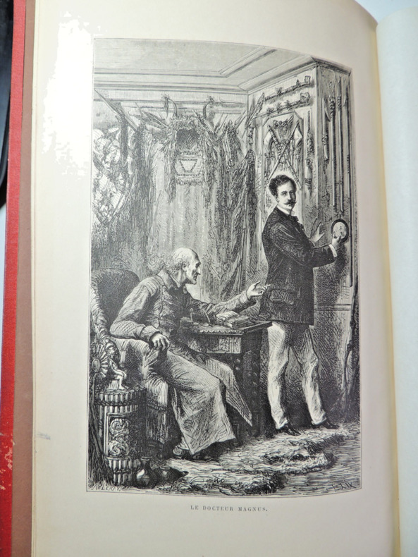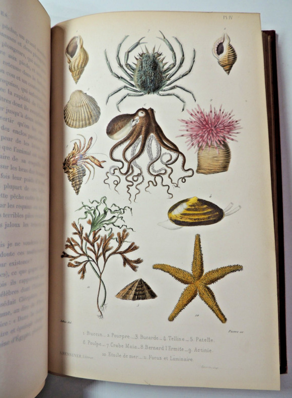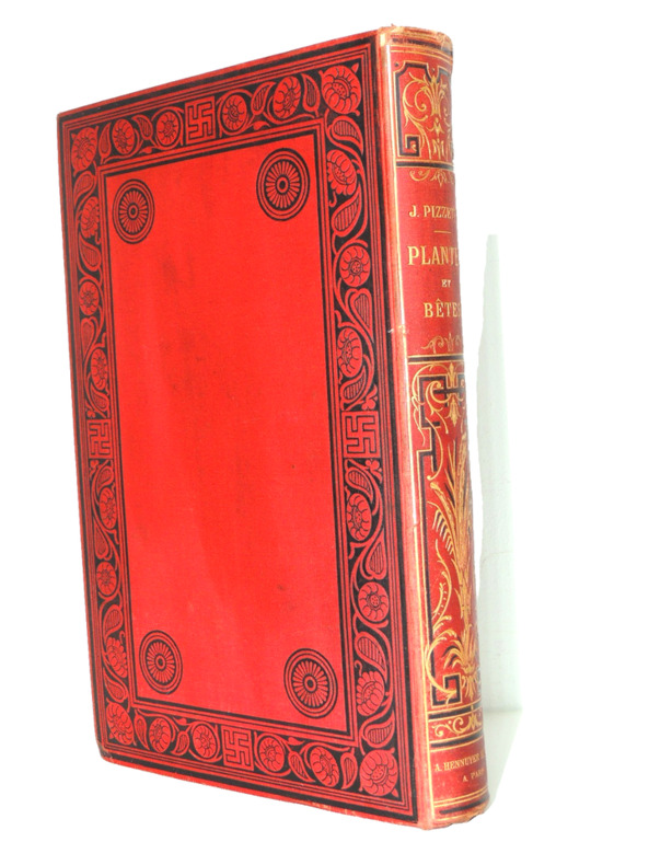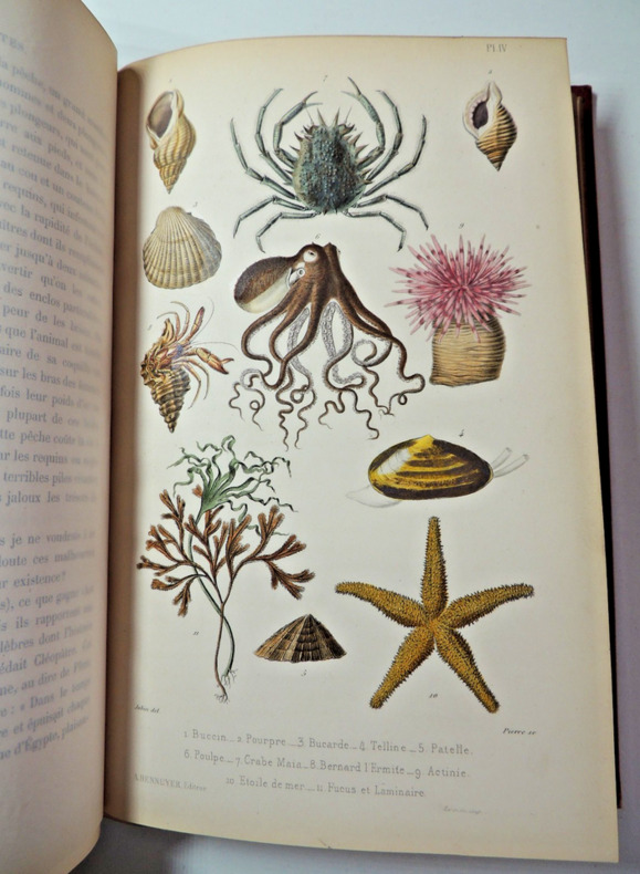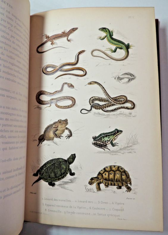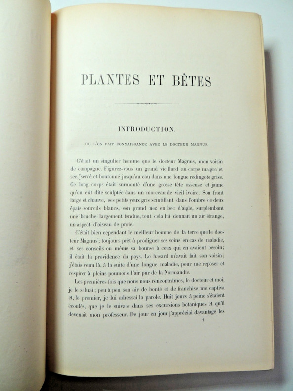 illustré de 150 gravures sur bois et 6 planches coloriées. Lors de mes dernières vacances, il avait été convenu, avec le docteur Magnus, que nous irions passer une huitaine de jours sur le littoral. Je me rendis à pied chez mon oncle, en Normandie, où nous devions nous réunir. Récit sous forme de narration de l'auteur; "J’avais pris le chemin des écoliers, et, après quelques jours de marche, rien encore ne m’indiquait le voisinage de la mer, lorsque, au détour d’un petit chemin creux, je me trouvai tout à coup au bord d’un long précipice coupé à pic : c’étaient les falaises normandes ". Table; en route - une visite au docteur - a travers champs - l'herborisation - les serres de mon voisin - à travers bois - dans le jardin du docteur - une volière naturelle - au bord de la mer - une vente à Fécamp - a propos d'une vipère - mon retour. Bel exemplaire, couverture éditeur un peu salie, frottements à la coiffe, gd format, 27x18, toutes tranches dorées, bon état intérieur, 442pp. Paris, A. Hennuyer, Imprimeur-éditeur, 1880