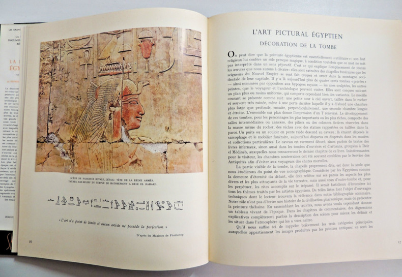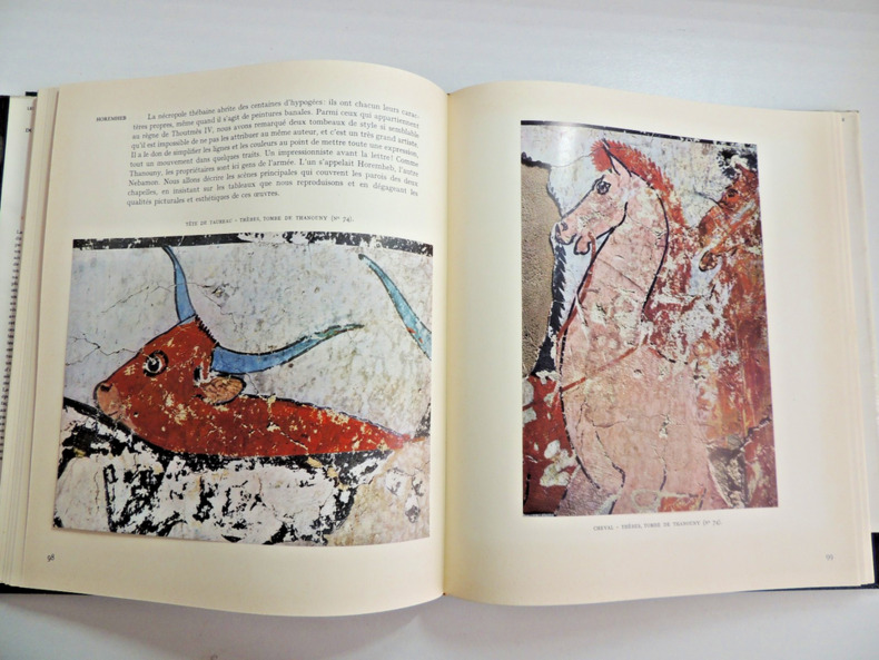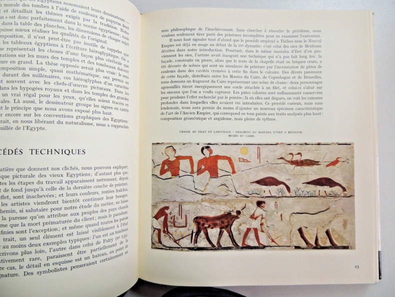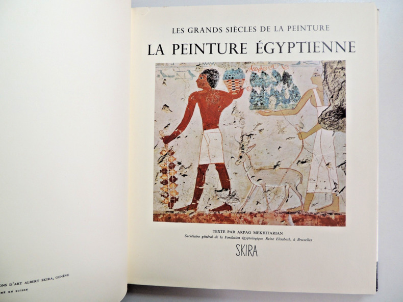Cet ouvrage s'attache à suivre les transformations de la peinture égyptienne entre 1500 et 1100 av. J.C. Il décrit trois étapes : celle d'un art pictural archaïque au début du Nouvel empire (Thoutmès III), auquel succède l'époque d'un style plus gracieux (Aménophis II et Thoutmès IV), avant de décrire un style plus académique jusqu'à la XIXème dynastie (Aménophis III et Aménophis IV), et enfin un style davantage soucieux du détail à l'époque des Ramses. L'auteur décrit également les techniques employées, combinant très souvent la sculpture suivie de la peinture, selon la nature du support : pierre, stuc ou plâtre. Complet volume, 28x25, très bel état, 164pp Edition Skira, Genève 1959