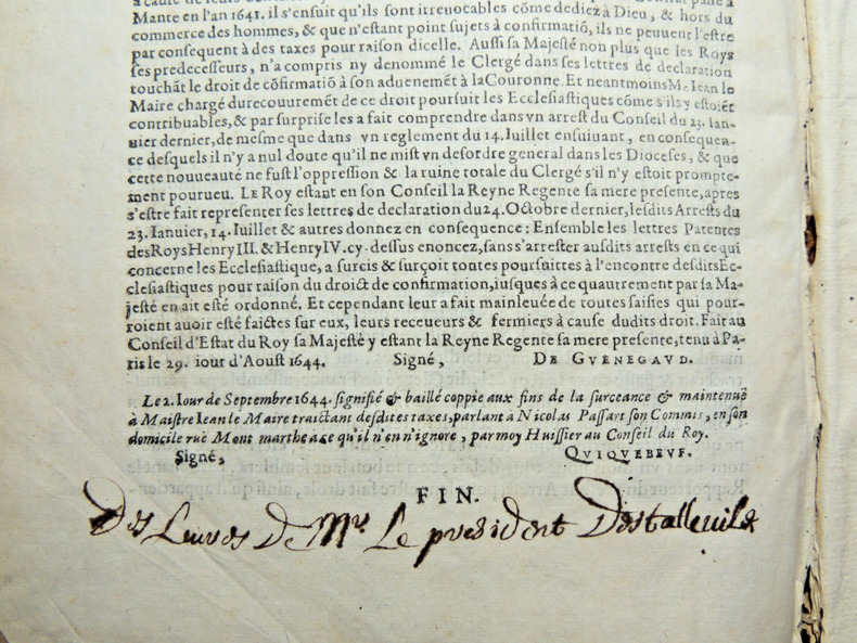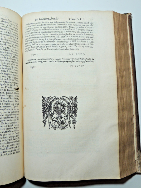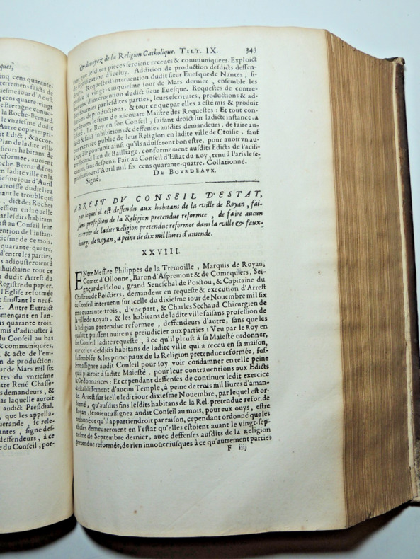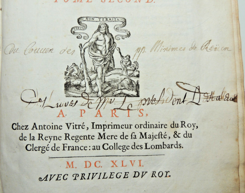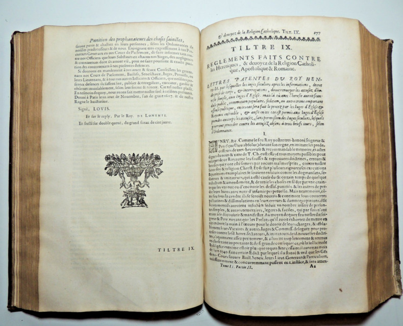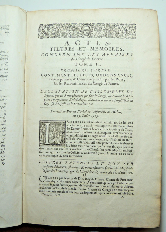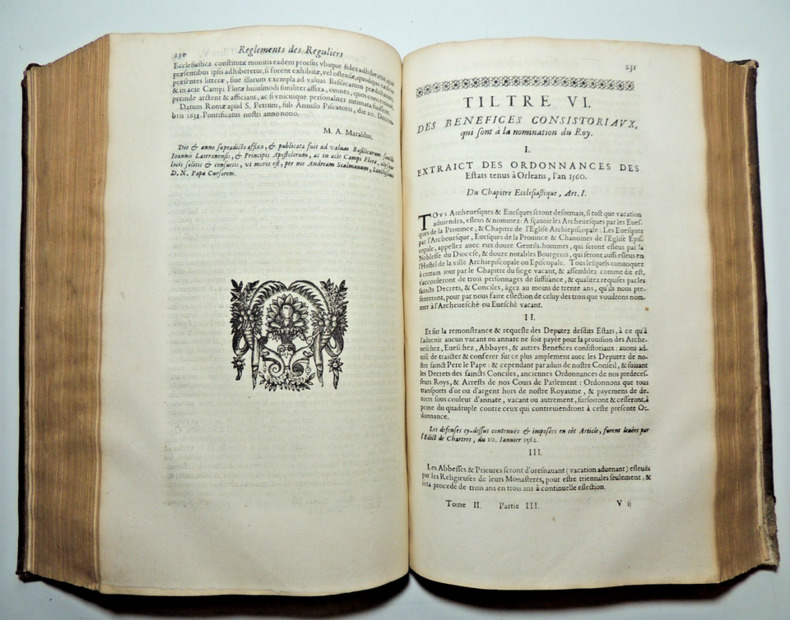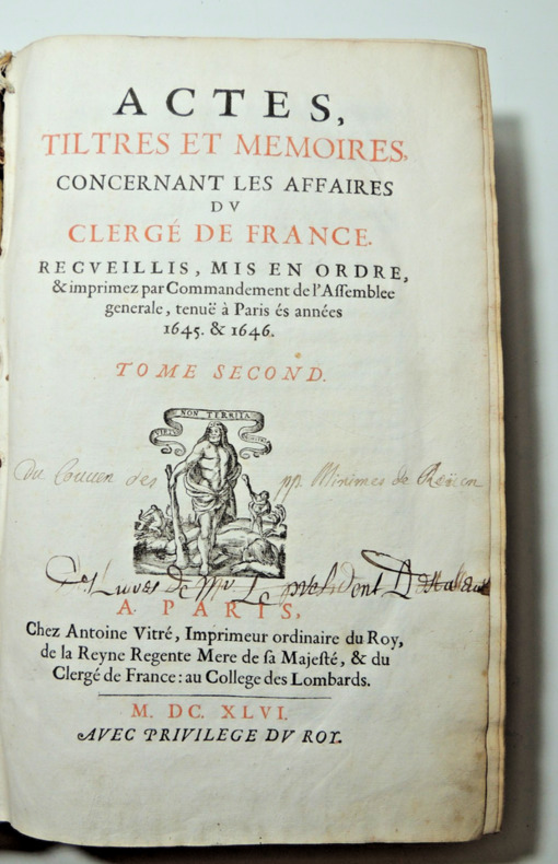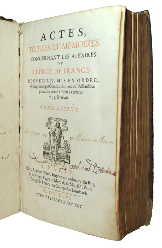 Louis Odespung de la Meschinière. 1597-1655 Tome II. contenant les Edicts, ordonnances, lettres patentes & cahiers répondus par les Rois, sur les remontrances du Clergé de France - ce qui regarde la Police & autorité de l’Église - ce qui regarde les personnes & bénéfices ecclésiastiques - ce qui regarde l'administration temporelle des biens de l’Église - contenant les immunitez, franchises & privilèges ecclésiastiques. volume in folio, 35x20cm, relié pleine basane époque, accrocs, intérieur avec un remarquable état de fraîcheur, complet en quatre parties; 424, 311, 204pp. Chez Antoine Vitré, Imprimeur ordinaire du Roy, de la Reyne Regente Mere de ſa Majesté, & du Clergé de France: au College des Lombards., MDCXLVI. Ex libris manuscrit, Mr le Président Destalleuil. exemplaire du Couvent des Minimes de Rouen.