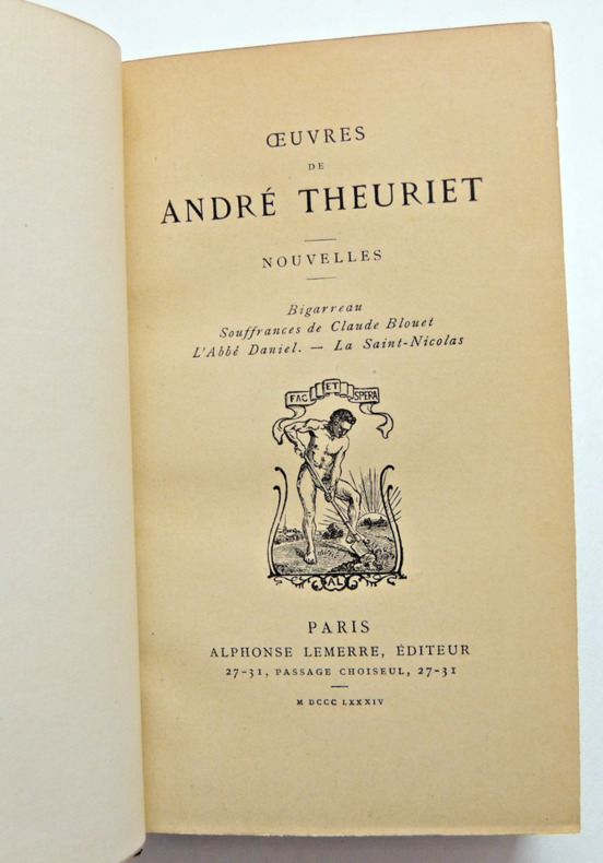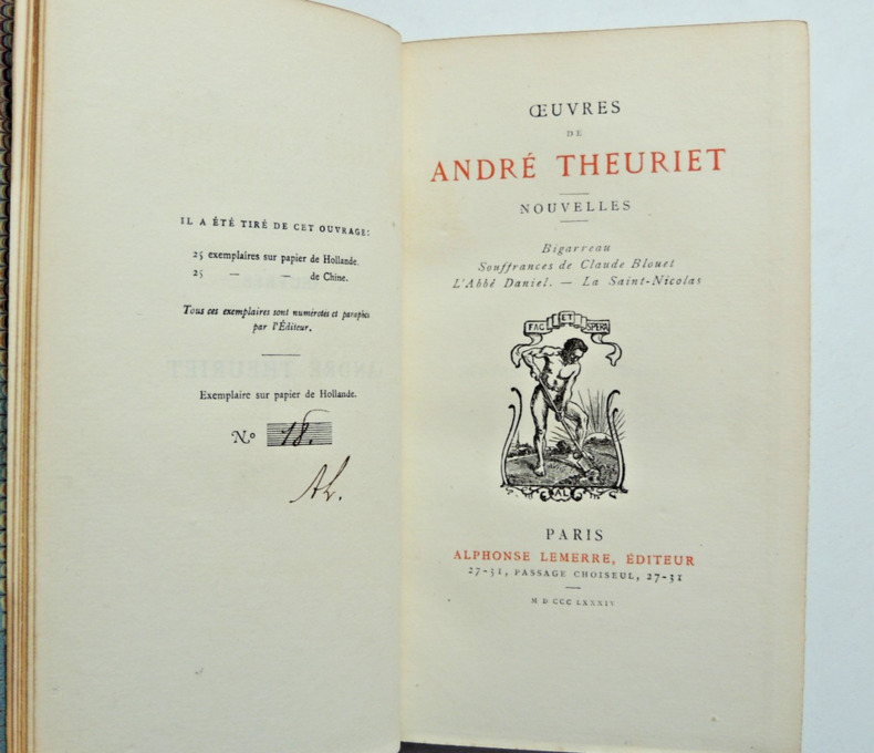 Table; Bigarreau, souffrance de Claude Blouet, L'Abbé Daniel, La Saint Nicolas Exemplaire sur papier de Hollande 18/25 signé par l'éditeur. Tampon du relieur V. Champs Très bel exemplaire, reliure de l'époque demi-maroquin à coins havane, 16,5x10cm, très bel état intérieur, 296pp. Couvertures d'origines conservées. Paris, Alphonse Lemerre, 1884 ref/299