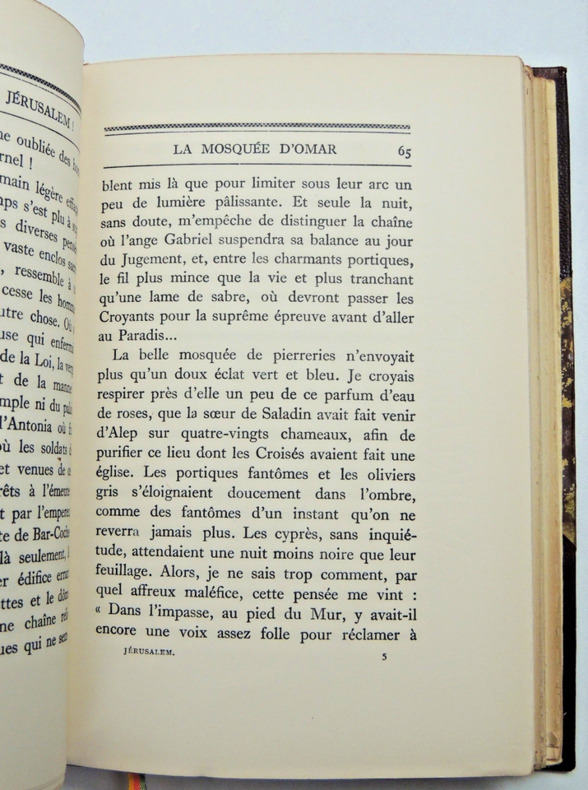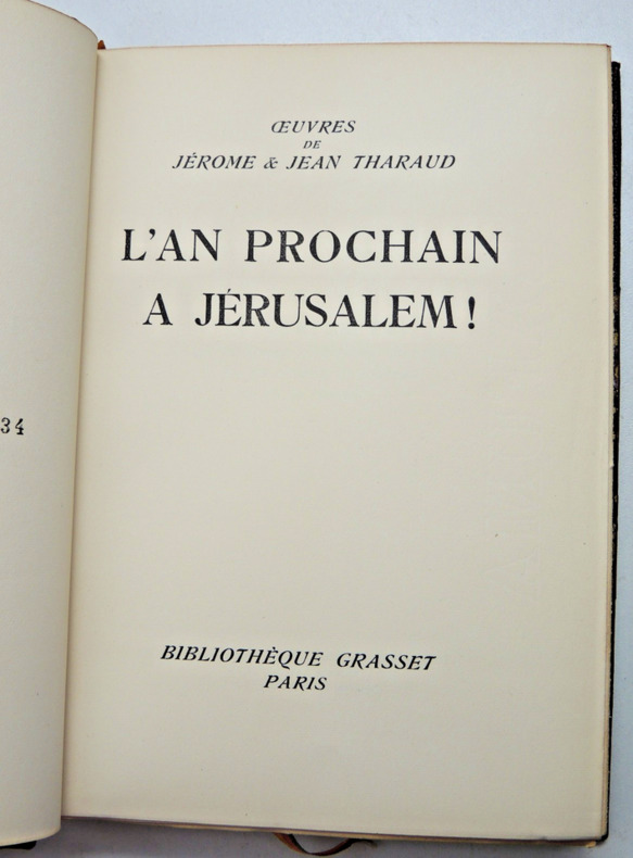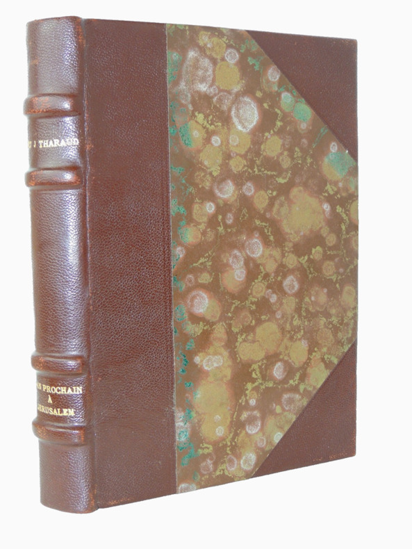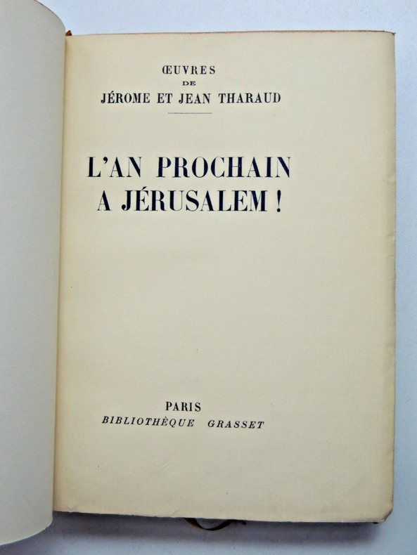 Entre le reportage et le récit de voyage, L'an prochain à Jérusalem raconte, avec une liberté de ton difficilement concevable aujourd'hui, la Palestine du début du siècle: au temps du mandat britannique, quand "palestinien" voulait dire "juif..". Sont ainsi évoqués, avec justesse et de fort pittoresque façon, la fin du règne ottoman, Herzl, les débuts du sionisme, les conflits, vite symbolisés par l'opposition Tel Aviv-Jérusalem, entre ceux qui attendent tout du ciel et ceux qui ne veulent compter que sur leurs propres forces; la renaissance de l'hébreu; la protestation arabe, l'inquiétude chrétienne, l'indifférence de Hirsch, la réticence de l'Alliance israélite universelle, l'activisme de Ben Yehouda, le soutien d'Edmond de Rothschild et l'ambivalence des juifs américains; la déclaration Balfour, la folle mise sur pied du premier réseau de renseignement militaire par la famille Aronsohn, et, déjà, le peu d'amour porté par le Quai d'Orsay à l'idée mème de Home national juif, invention du Foreign Office. Exemplaire numéroté sur vélin pur chiffon, n°934 vol relié, demi cuir à coins, superbe reliure, couvertures d'origines conservées, 190x125, parfait état intérieur, 227pp. Paris, Plon 1930 ref/106