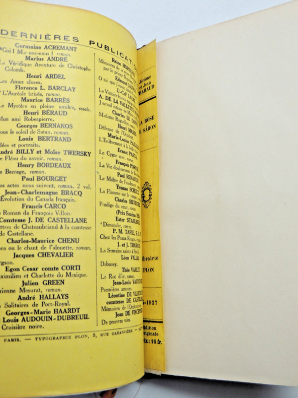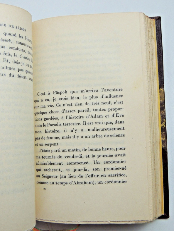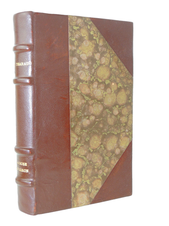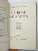 La rose de saron, appelées "narcisse" étaient partout en Israël . Alors, lorsque la Jeune femme sunamite dit : " Je suis un narcise de saron ", les théologiens disent qu'elle voulait tout simplement dire dire au Roi " Je ne suis pas spéciale, je ne suis qu'une fleur ordinaire, une rose dans la plaine " La Rose de Sharon symbolise l'amour, la beauté et la guérison pour les chrétiens, les messianiques et les juifs. « La Rose de Sharon » se trouve dans le Cantique de Salomon 2: 1 et fait référence à une belle jeune femme et à des sentiments d'amour pour elle. Exemplaire de l’Édition Originale sur papier de fil vol relié, demi cuir à coins, superbe reliure, couvertures d'origines conservées, 190x125, parfait état intérieur, 288pp Paris, Plon 1927 ref/106