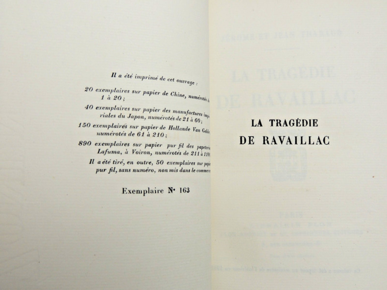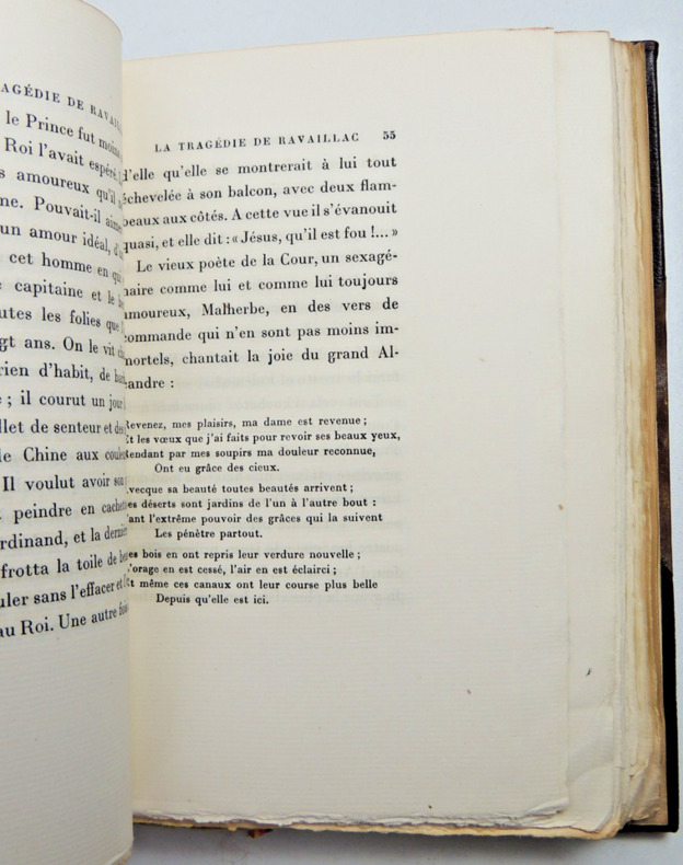 L'assassinat d'Henri IV , roi de France et de Navarre, est l'un des événements marquants de l'histoire de France. Le roi meurt sous les coups de couteau de François Ravaillac le 14 mai 1610 Exemplaire numéro 163 sur pur fil Lafuma vol relié, demi cuir à coins, superbe reliure, couvertures d'origines conservées, 20x15cm, parfait état intérieur, broché, non rogné, 272pp. Paris, Plon 1920 ref/106