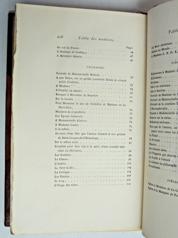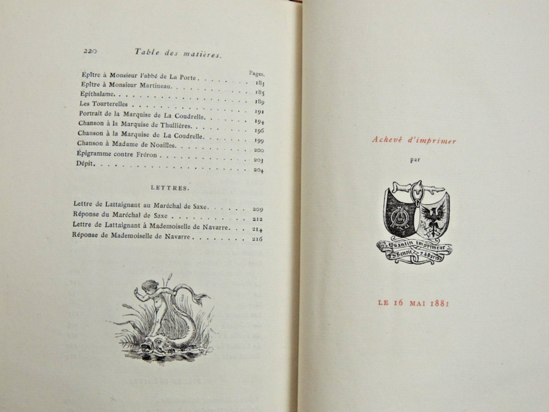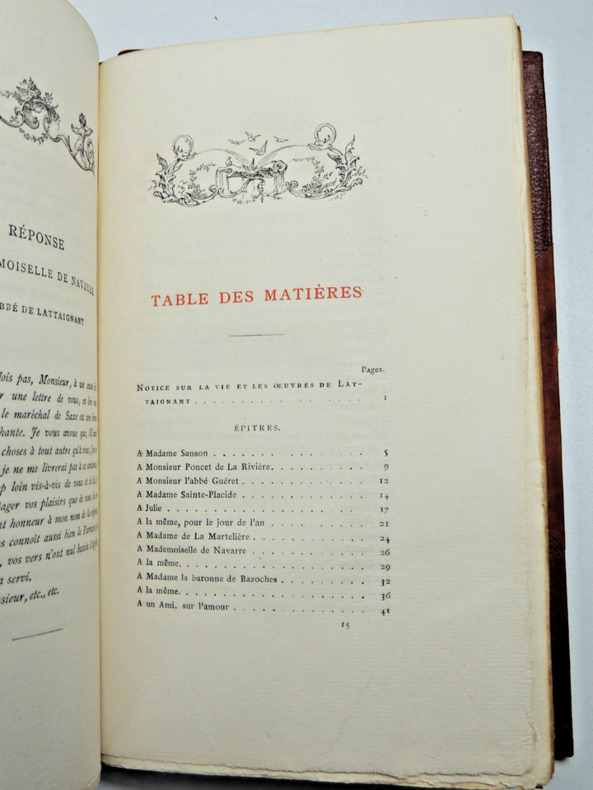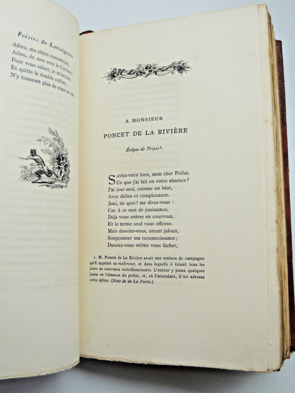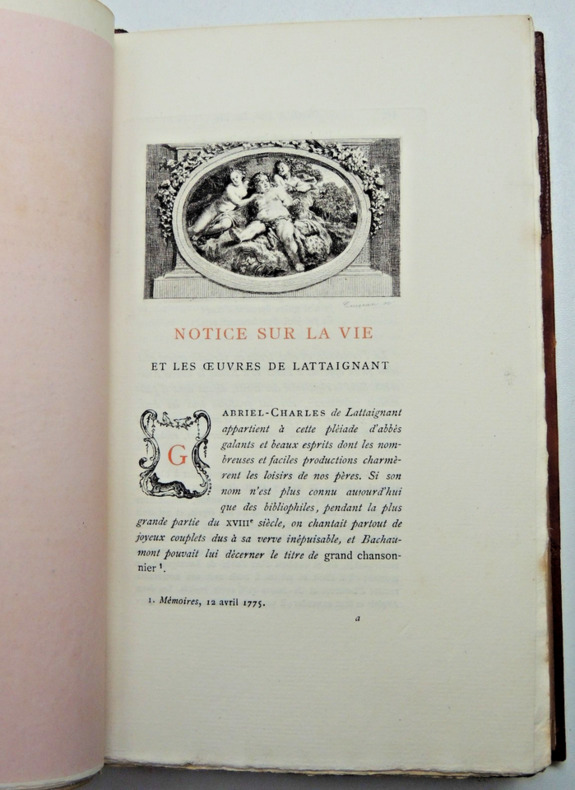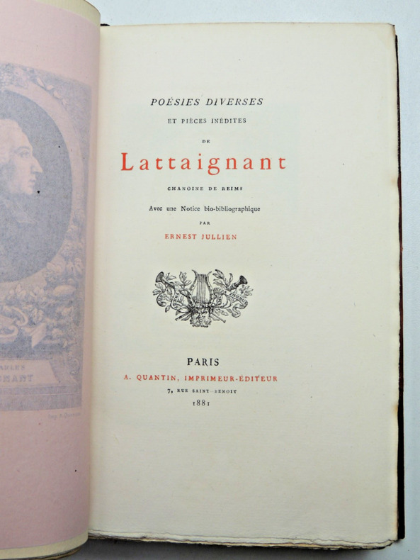 avec une notice bio-bibliographique par Ernest Jullien. L'Abbé de Lattaignant. (1697-1779). Bien que son nom soit oublié, les vers qu'écrivit celui qu'on surnommait de son vivant "Le grand chansonnier" ont passé les siècles. En témoigne "J'ai du bon tabac dans ma tabatière..." chanson populaire universellement connue dont il est probablement l'auteur et qui, dans l'une de ses strophes, éclaire le peu de vocation religieuse de ce prêtre, qui, étant le fils puîné de la famille, dut laisser l'héritage à son frère, et partir étudier au Séminaire des Bons-enfants. contient; les épitres, les pièces diverses, chansons, pièces inédites, lettres. Une œuvre littéraire précieuse, témoin d’une plume savante et d’un regard érudit sur son époque. Demi-reliure basane, dos rond. Tirage à petit nombre. Très beau papier vergé. Portrait gravé en frontispice. Très bon état, 220pp. vol in8, 21x14, très bel état, agréable lecture parsemée d'illustrations romantiques et d'eaux fortes. Couvertures conservées. Paris, A. Quantin, Imprimeur éditeur, 1881 ref/106
