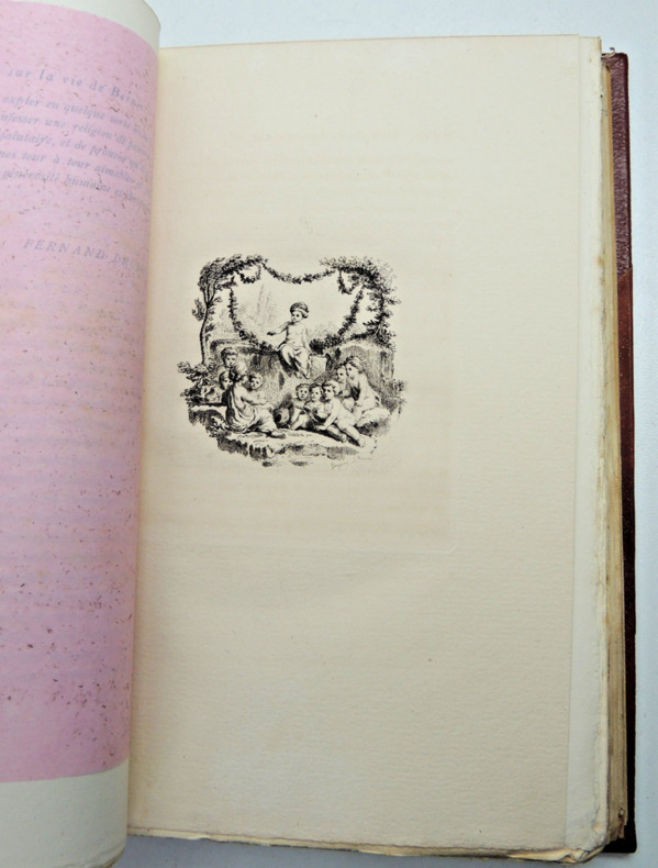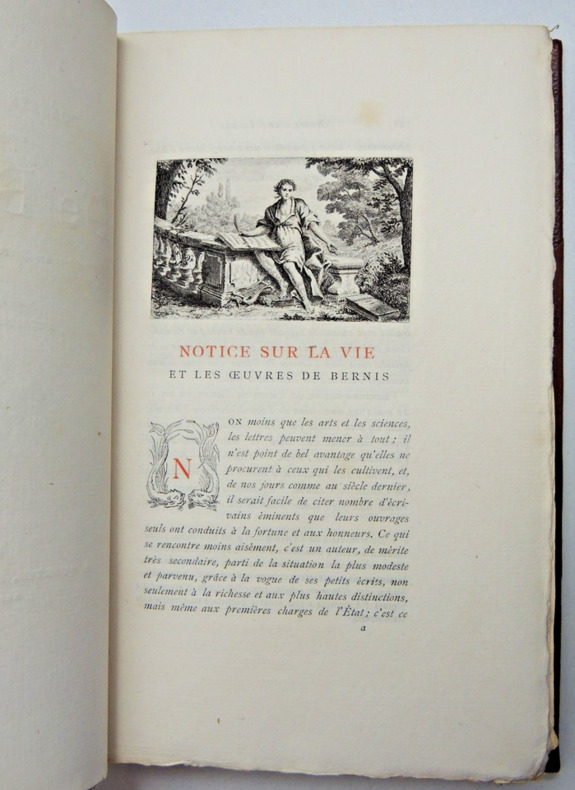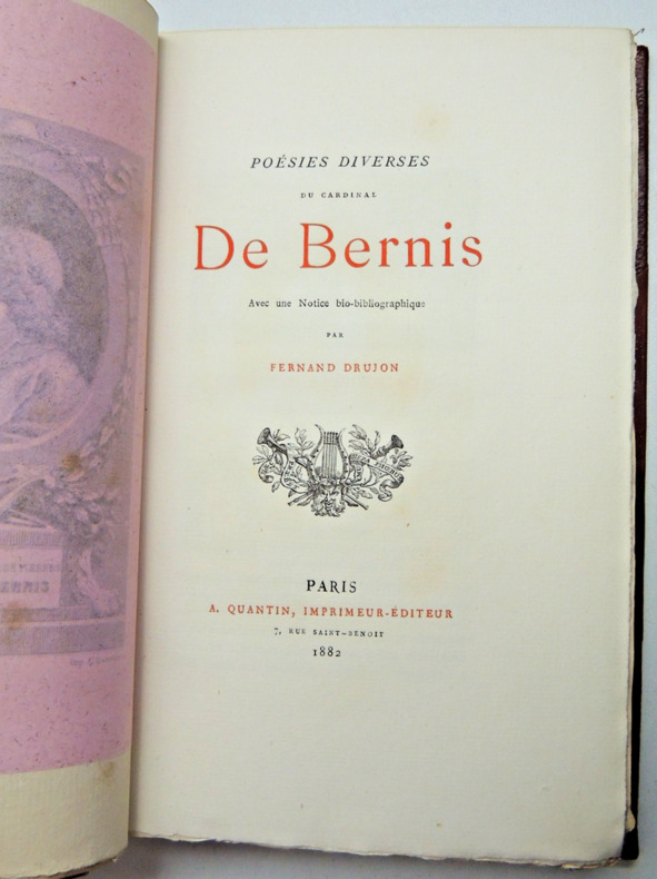 avec une notice bio-bibliographique par Fernand Drujon. François-Joachim de Pierre, cardinal de Bernis, né le 22 mai 1715 à Saint-Marcel-d'Ardèche et mort le 3 novembre 1794 à Rome, est un homme de lettres et diplomate français. Demi-reliure basane, dos rond. Tirage à petit nombre. Très beau papier vergé. Portrait gravé en frontispice. Très bon état, 247pp. vol in8, 21x14, très bel état, agréable lecture parsemée d'illustrations romantiques et d'eaux fortes. Couvertures conservées. Paris, A. Quantin, Imprimeur éditeur, 1882 ref/106