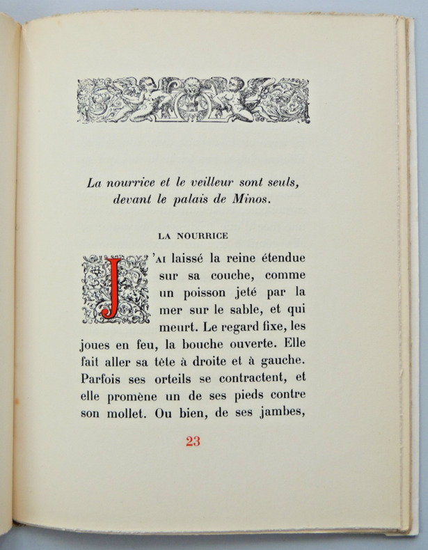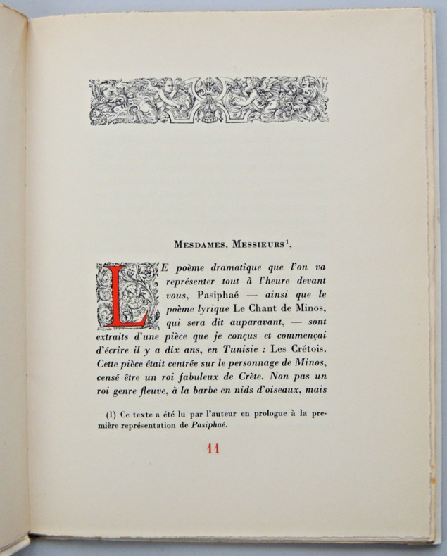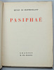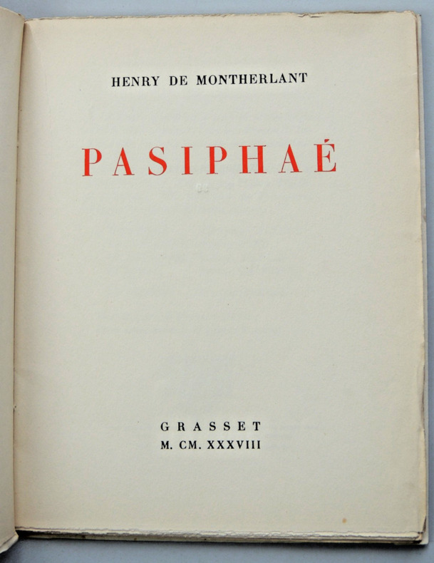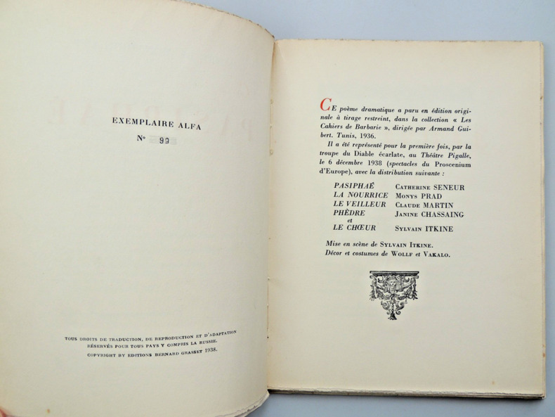 En un discours passionné, Pasiphaé résume la légende qui court depuis les temps archaïques sur la naissance du Minotaure, ce fils monstrueux dont la tête de taureau personnifie la faute funeste de la reine. Un mythe qui a connu diverses versions et interprétations. vol broché, couverture rempliée, 220x175, très bon état int. 70pp exemplaire sur Alpha n°99/1800, Ex libris Paul Chambrillon Grasset. achevé d'imprimé le 2 décembre 1938 ref/20
