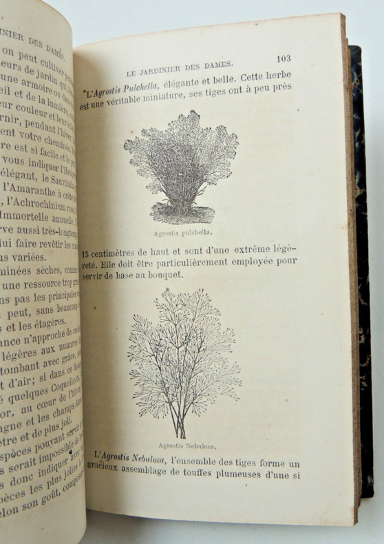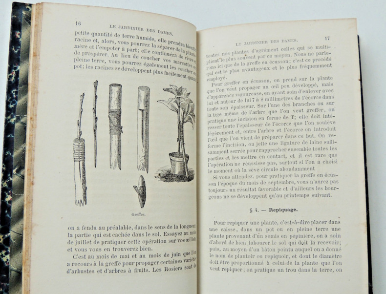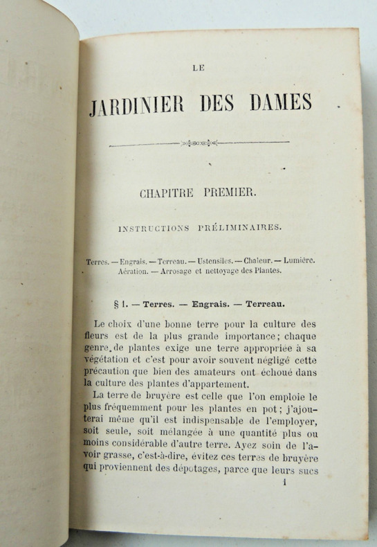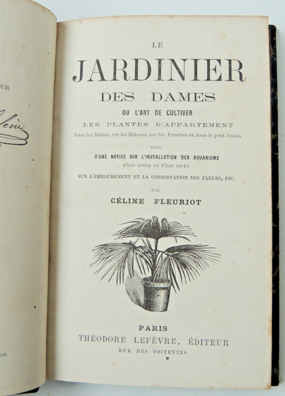 table: instructions préliminaires - des petites opérations de jardinage - des serres d'appartement - jardins sur les fenêtres et les balcons - les fleurs et les plantes d'appartement - les arbres fruitiers d'appartement - les petits jardins dans les grandes villes - aquariums - conservation des végétaux - vocabulaire des termes de botanique. vol relié demi cuir, 180x120, qq rousseurs, bon état int. 212pp. rare exemplaire. Paris, Théodore lefèvre, ss date, vers 1870 ref/209