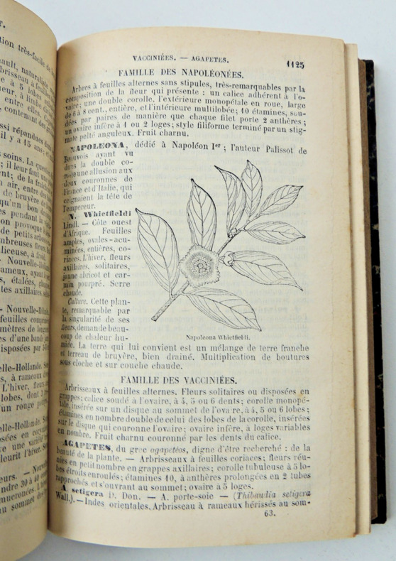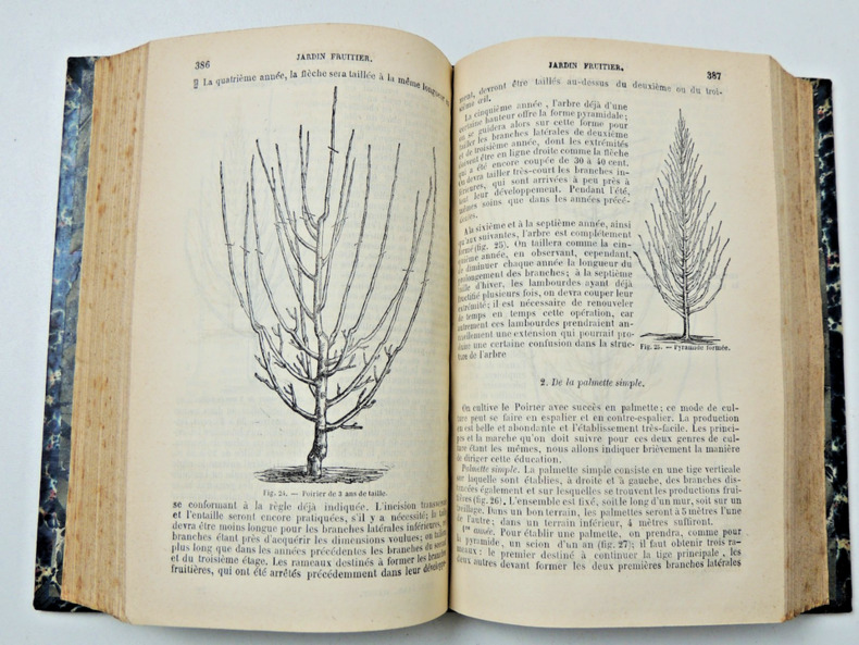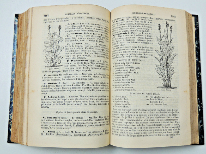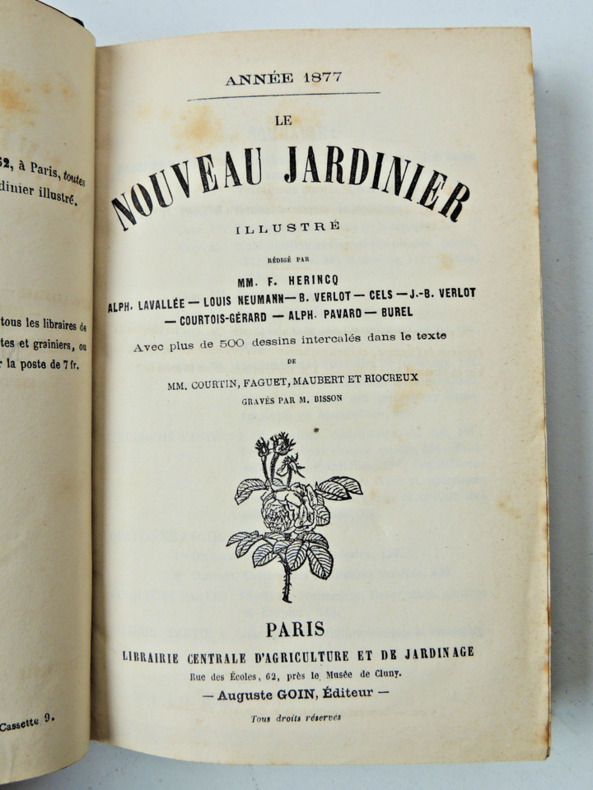 Rédigé par MM. F.HERINQ, Alphons LAVALLEE, louis NEUMANN, B. VERLOT, CELS, J.B VERLOT, COURTOIS Gérard, Alphons PAVARD, BUREL. Plus des 500 dessins dans le texte par MM. COURTOIS, FAGUET, MUABERT et RIOCHAUX, gravés par BISSON. Paris Librairie de E. DONNAUD 1868. Petit in 8 demi- cuir bleu marine à nerfs 180x120mm, titre, filets dorés. Titre-XX-1827 pages. Epidermure en pied, sans gravité. Des rousseurs plus ou moins fortes ou concentrées, habituelles
