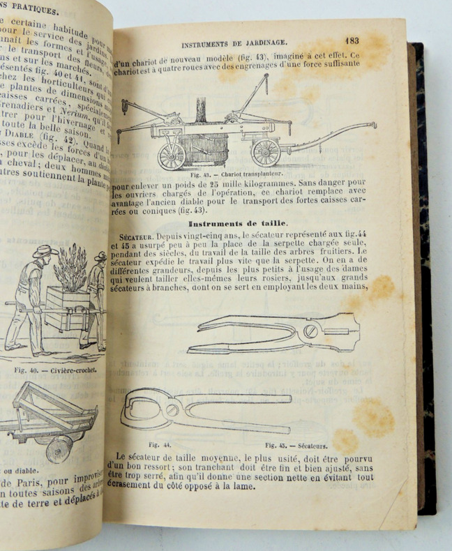 avec plus de 500 dessins intercalés dans le texte de MM. Courtin, Faguet, Maubert & Riocreux, gravés par Bisson Travaux de chaque mois - Notions pratiques de jardinage - Jardin fruitier - Jardin potager - Végétaux d'ornement - Liste des horticulteurs français et étrangers - liste des Directeurs de jardin en Chef des jardins botaniques Français et étrangers. Complet en deux tomes, vols reliés demi cuir, 180x120, qq rousseurs, bon état int. 1173pp en continues. rares exemplaires. Paris, Librairie Centrale d'Agriculture et de Jardinage, 1877 ref/209