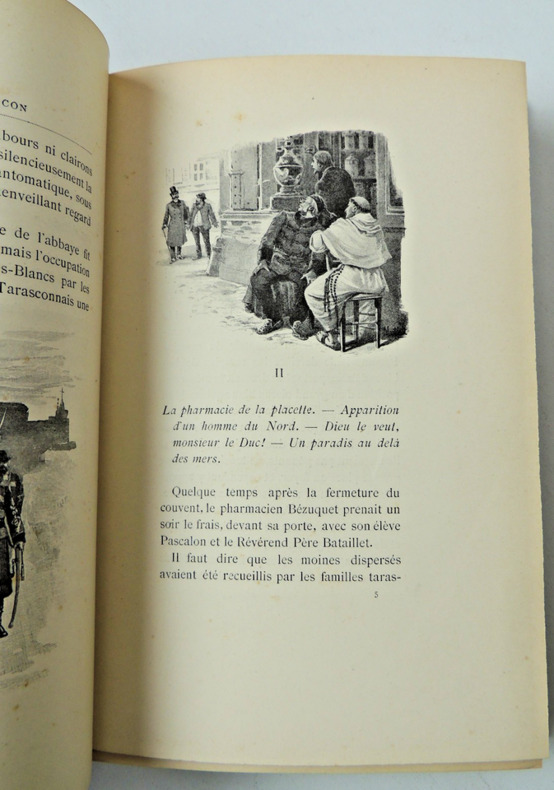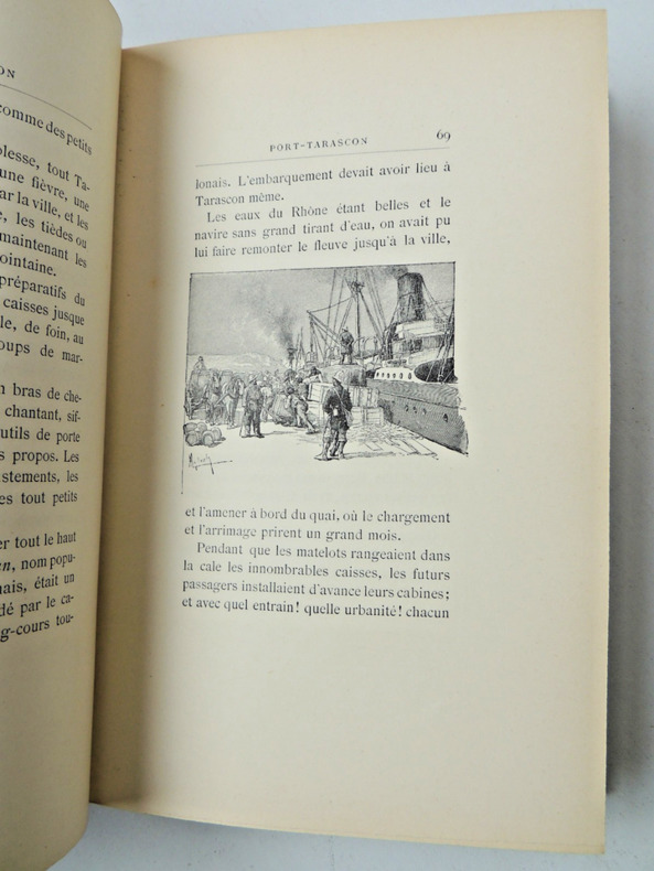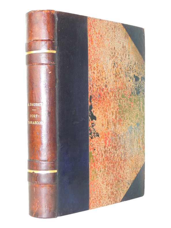 1ère édition (après 125 exemplaires d'édition originale sur grands papiers) de ces "dernières aventures" du héros tarasconnais d'Alphonse DAUDET (1840-1897), illustrée de dessins d'Ernest BIELER, Luigi CONCONI, Louis MONTEGUT, Frédéric MONTENARD, Felician von MYRBACH et Luigi ROSSI. Tragi-comique "récit [...] pris du vrai" (l'auteur), inspiré à l'écrivain par une entreprise de colonisation de Port-Breton, en Papouasie-Nouvelle-Guinée, et précédé d'une note de l'écrivain décrivant son arrivée dans un Tarascon vidé de ses habitants: s'enquérant de leur sort, on lui répond: "[...] Partis, les Tarasconnais... Partis coloniser, l'illustre Tartarin en tête... Et tout emporté avec eux, déménagé jusqu'à la Tarasque !" Exemplaire relié.
