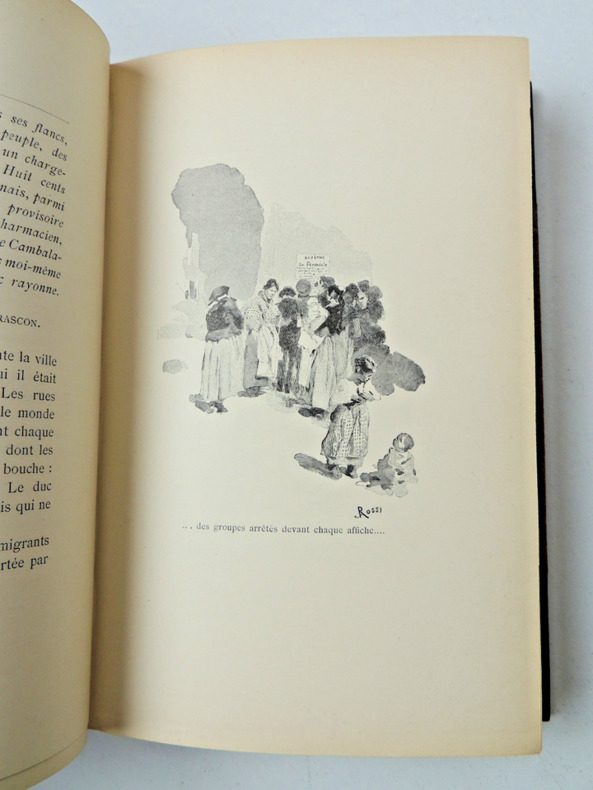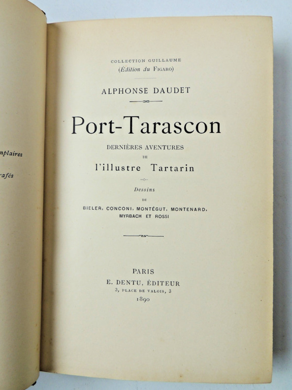 Dessins de Bieler, Conconi, Montégut, Montenard, Myrbach et Rossi. Il s’inspire cette fois de l’expédition du marquis de Rays en Nouvelle-Irlande dans les années 1880. Tartarin tient le rôle du marquis Charles de Rays et enjoints les habitants de Tarascon à établir une colonie en Papouasie-Nouvelle-Guinée. Les mésaventures des colons et le procès qui suit leur entreprise constituent le cœur de la narration. Le dernier chapitre voit la mort de Tartarin. Commissionné par le Harper’s Monthly Magazine, Henry James traduit le roman en anglais à partir de 1889. La transcription apparait en feuilleton de juin à novembre 1890 avant d’être publié en livre en 1891 par Sampson Low, Marston, Searle & Rivington à Londres. volume gd in8, relié demi cuir, 24x16cm, frottements à la coiffe, très bel état intérieur, beau papier de cette édition, 388 pages. Paris, Dentu. Collection Guillaume 1890
