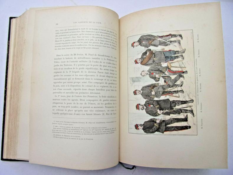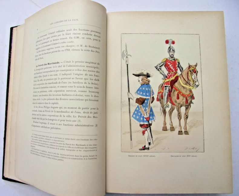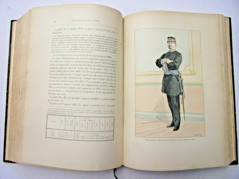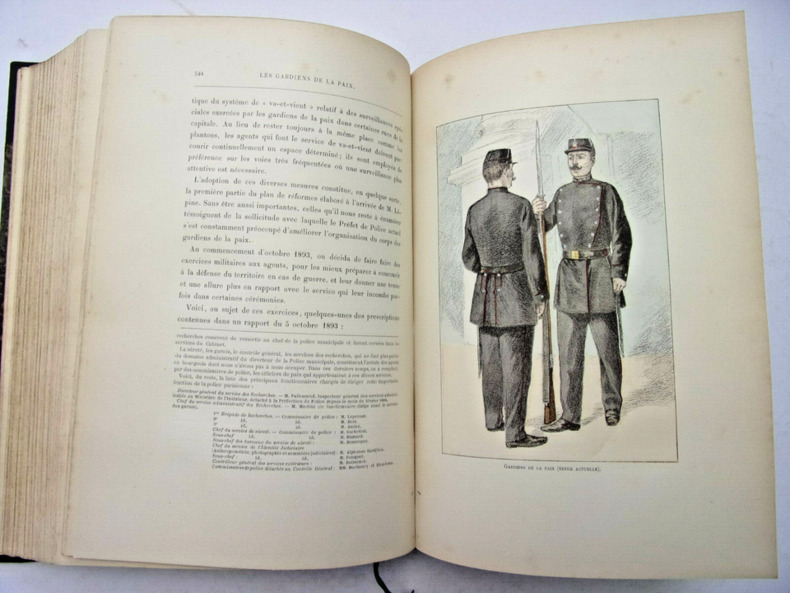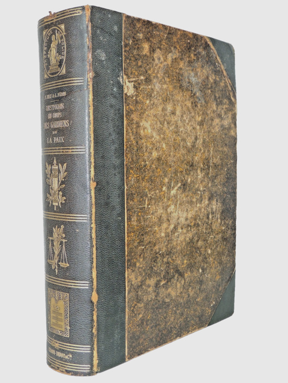 Ouvrage publié sous les auspices de M. Louis Lépine Préfet de police. Préface de M. Waldeck-Rousseau Sénateur, Ancien Ministre de l'Intérieur. Reliure demi-chagrin marine. Dos lisse orné des symboles républicains: glaive et balance de la Justice, feuilles de chêne et faisceaux, tables de la loi, sceau de la préfecture de police, le tout intercalé entre de triples filets dorés figurant les nerfs. Trois tranches jaspées. Couverture et dos conservés. Intérieur avec rousseurs éparses. Orné de 44 planches en couleurs d'un frontispice d'Edouard Detaille et de 266 gravures en noir. Reliure signée "Engel".