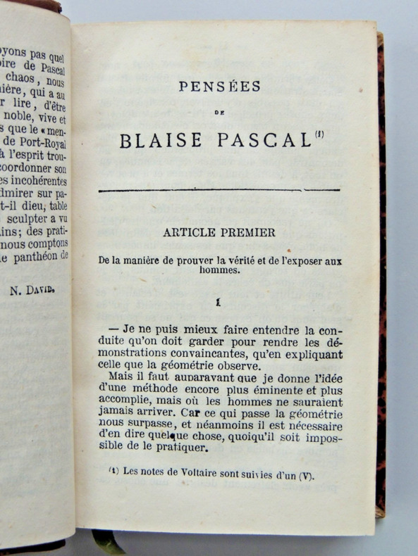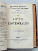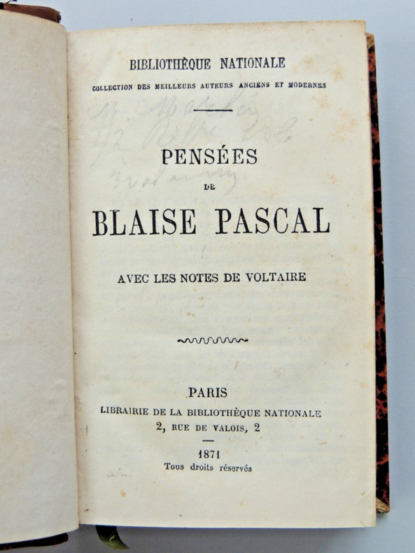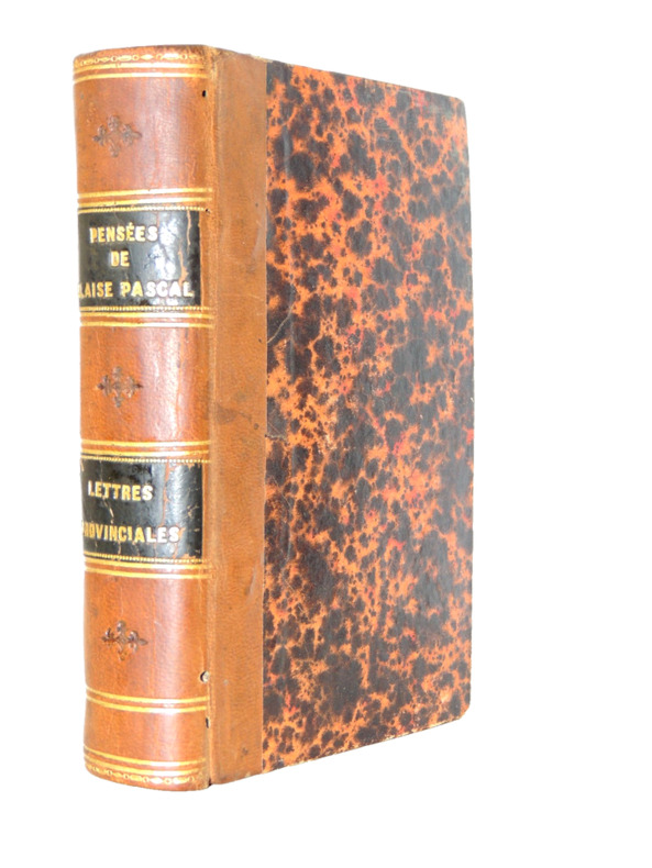 Pensées de Blaise Pascal. Recueil philosophique et théologique inachevé de Blaise Pascal. Thèmes principaux : condition humaine, foi, raison, morale chrétienne. Édition annotée par Voltaire, apportant un éclairage critique des Lumières. Lettres provinciales (Tomes I et II). Série de lettres écrites par Pascal sous pseudonyme (Louis de Montalte). Critique des jésuites et défense du jansénisme. Importante contribution à la littérature polémique et religieuse du XVIIe siècle. vol in12, 8x7, relié demi cuir, usures d'usages, 192, 190, 192 pages Paris Bureau de la Publication, 1871 ref/299