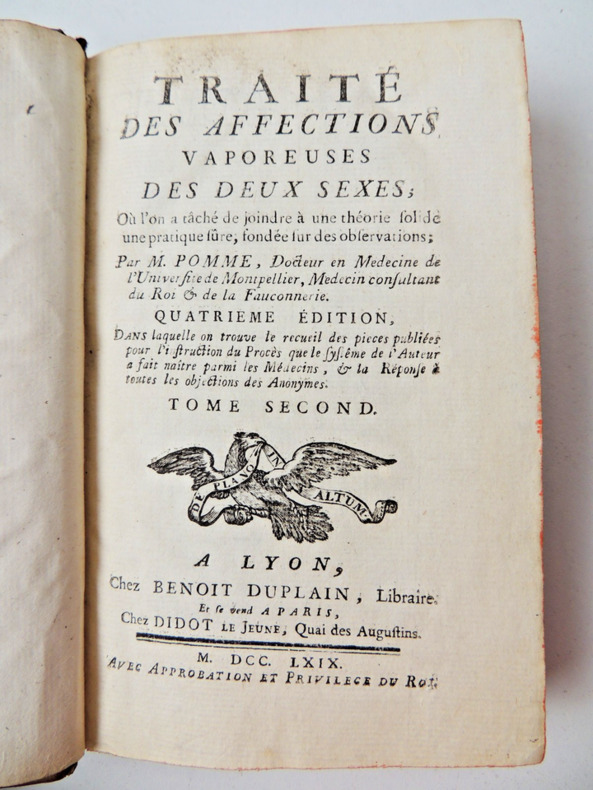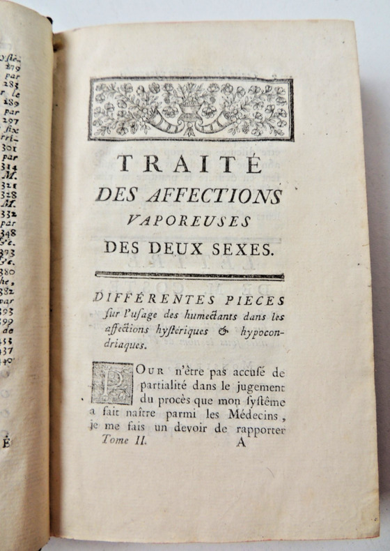 (Les "Vapeurs" dans un très rare exemplaire armorié de la bibliothèque de Louis-Charles de Bourbon, Comte d'Eu, Grand Maître de l'Artillerie de France et Colonel Général des Cent-Suisses. Ensuite passé au Duc de Penthièvre, beau-père de la Princesse de Lamballe grande malade de "Vapeurs") (www.cepays-ci.com)