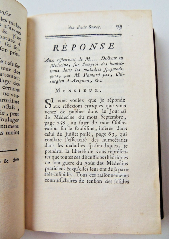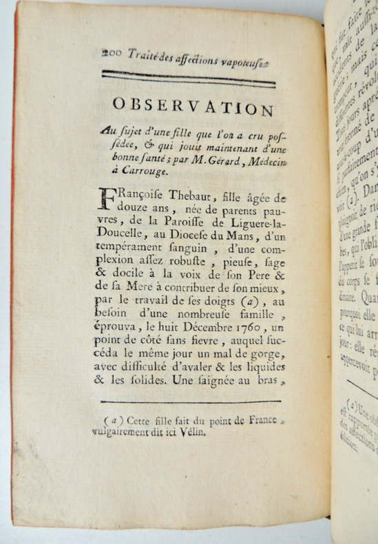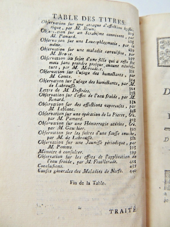 Tome II; usage des humectants, espèce particulière de vapeurs, observation d'une jeune fille que l'on a cru possédée, épanchements de lait, attaque hystérique, strabisme, hémorragie, effet de l'eau froide, suite d'une fausse couche, jaunisse, maladies des nerfs, etc.. vol in12, 180x90, relié pleine basane époque, 465pages, bon état intérieur, bien frais. Rare. Paris, Benoit Duplain, Didot MDCCLXIX ref/145