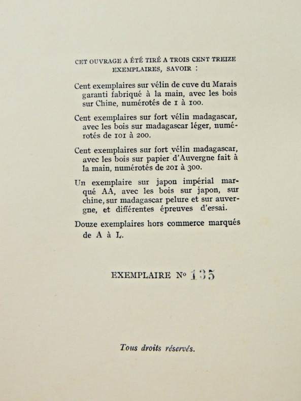 Tirée à 313 exemplaires; celui-ci sur vélin madagascar, avec les 20 bois hors-texte sur papier d'Auvergne fait à la main et tirés par Serge Kotinski.