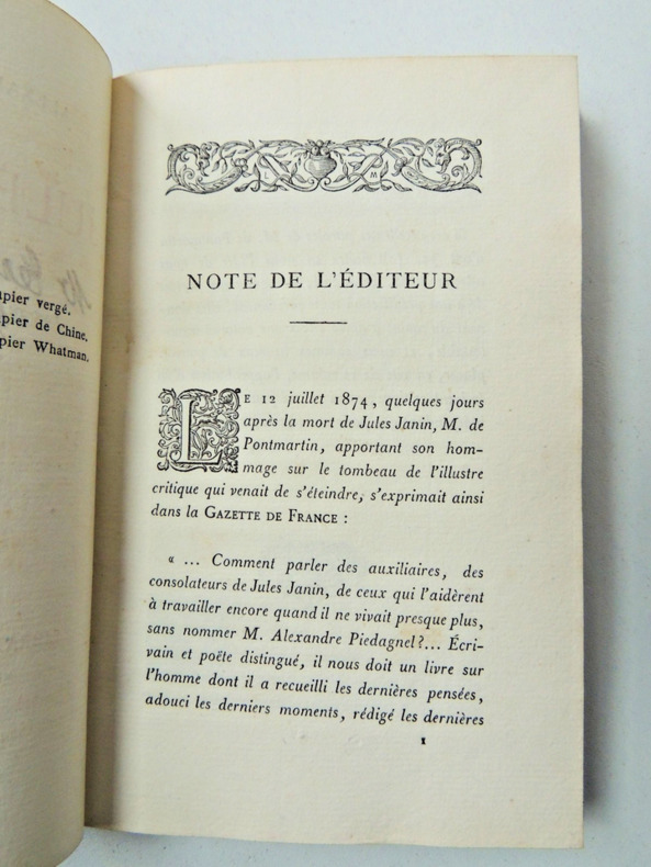 Edition originale de ce recueil d'anecdotes sur la vie de Jules Janin. Alexandre Piédagnel (1831-1903) était l'un de ses plus proches amis.