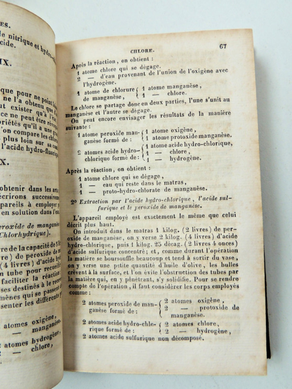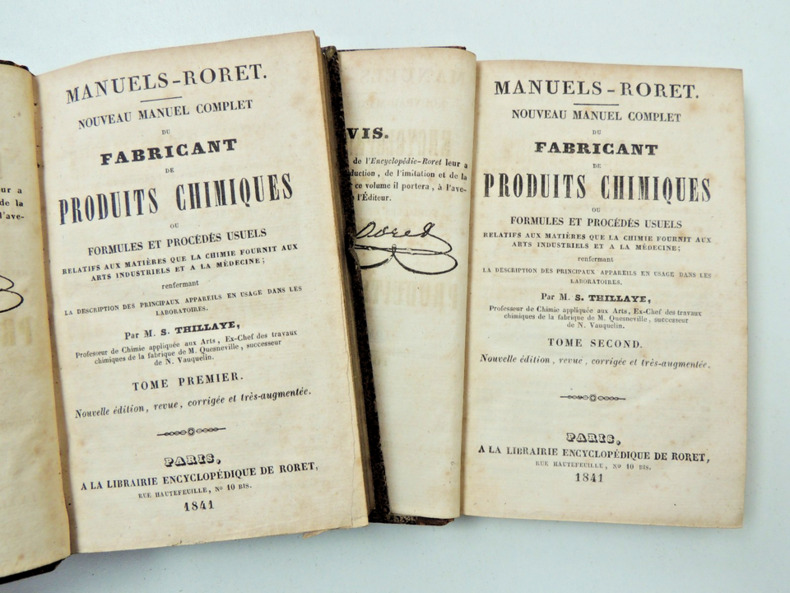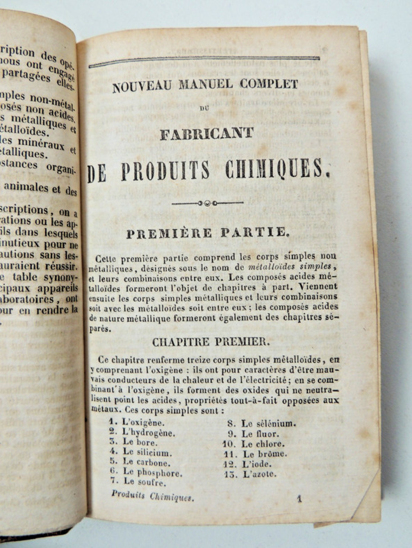 2 volumes comprenant ; Les corps simples non-métalliques et leurs composé non acides - Les corps métalliques et leurs combinaisons entre eux et les métalloïdes - Les acides minéraux et leurs combinaisons avec les oxides métalliques in12, demi cuir, 15x10, reliures usagées, ensemble restant solide, bon état intérieur, complet de ses 4 planches dépliantes, 282, 314pp Paris, Librairie Encyclopédique Roret, 1841 ref/299