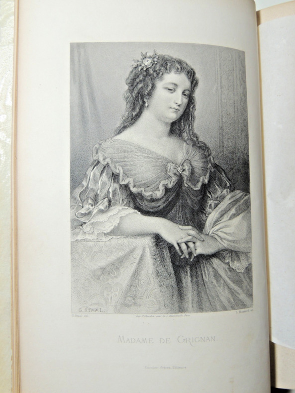Précédées d'une notice par Grouvelle, d'observations littéraires par Suard accompagnées de notes explicatives sur les faits et les personnages du temps, ornées d'une galerie de portraits historiques dessinés par STAAL. de Sévigné 13 portraits h.-t. par Staal gravés au burin sur acier par Massard, Delaunay, Regnault, Outhwaitte etc. Rousseurs. Madame de Sévigné est devenue un grand écrivain presque sans le vouloir et le savoir. Ses lettres sont nées de sa conversation vive, enjouée, coulant de source dont elle a pu conserver, à l'intention de ses correspondants, la succulente spontanéité. Lettres de la ville, lettres de la cour, lettres de Bretagne, lettres au cousin Bussy. Lettres surtout à sa fille, les plus belles après le départ de Mme de Grignan pour la Provence, où son mari était nommé lieutenant-général. "La passion parle là toute pure", comme aurait dit Alceste et comme le dira un personnage de Proust : "ce que ressentait Mme de Sévigné pour sa fille peut prétendre beaucoup plus justement ressembler à la passion que Racine a dépeinte dans Andromaque ou dans Phèdre que les banales relations que le jeune Sévigné avait avec ses maîtresses Belle édition ornée de remarquables portraits de Madame de Sévigné et de ses contemporains. Précédé d'une notice par Grouvelle, d'observation littéraires par Suard, accompagné de notes explicatives sur les faits et sur les personnages du temps Fort volume in-4, 175x190, relié demi chagrin rouge, dos à nerfs, qq rousseurs, toutes tranches dorées, 792pp, pages uniformément brunies Belle édition de ce superbe ouvrage ! Paris Garnier ss date vers 1860/70