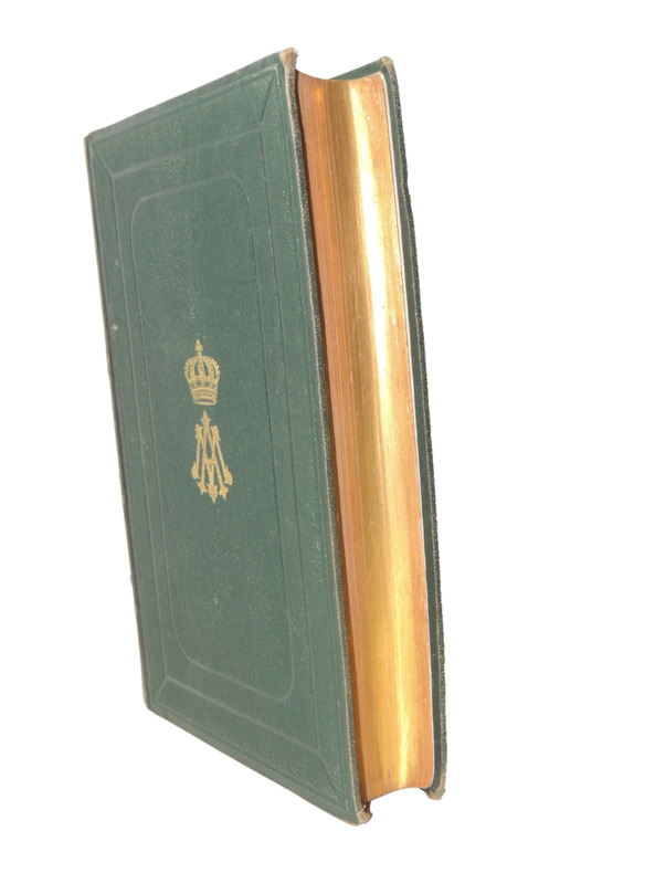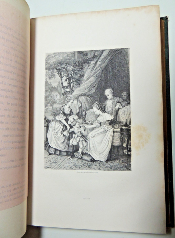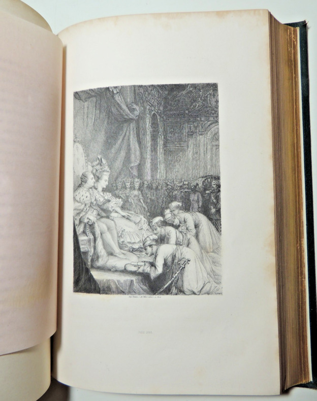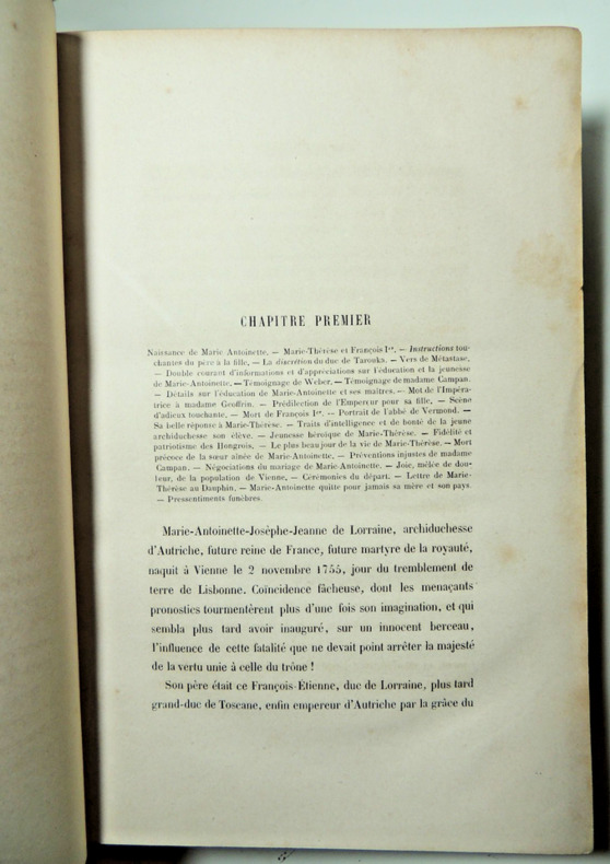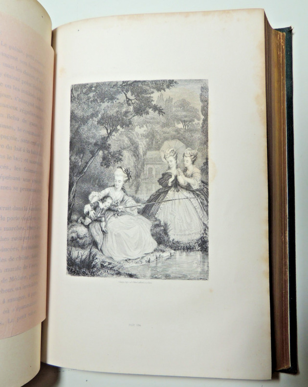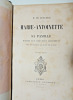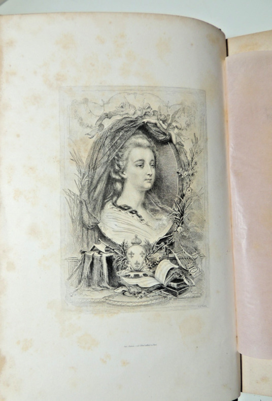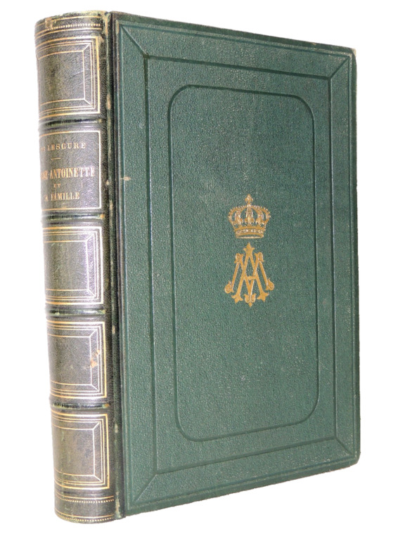 D'après les nouveaux documents, avec 10 gravures sur acier par Staal. Au sommaire de cet ouvrage sur Marie-Antoinette et sa famille (Madame Elisabeth, Marie-Thérèse, Princesse de Lamballe, Louis XVI, Louis XVII, etc.) : La jeunesse de Marie-Antoinette (1755-1774), La reine du Trianon (1774-1785), La grande mère (1785-1789), La grande reine (1780-1791), Les martyrs (1791-1795). Lettres MA couronnés de Marie-Antoinette frappés à chaud au centre du plat supérieur, Un volume , in-4, relié demi-cuir, frottements, 280x190, toutes tranches dorées, 648 pp Paris, Ducrocq 1860