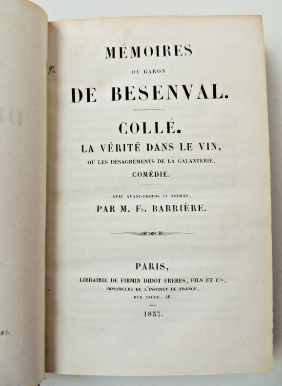 Les Mémoires du Baron de Bésenval occupent les pages 27 à 383 et La Vérité dans le vin, de Collé, occupe les pages 385 à 437. ...................... Photos sur demande ..........................