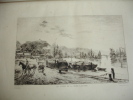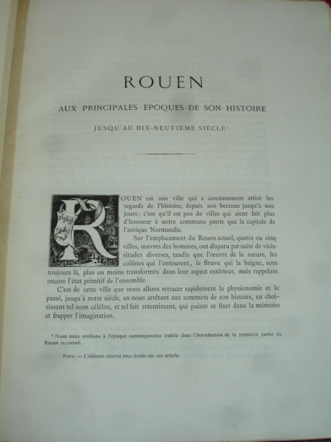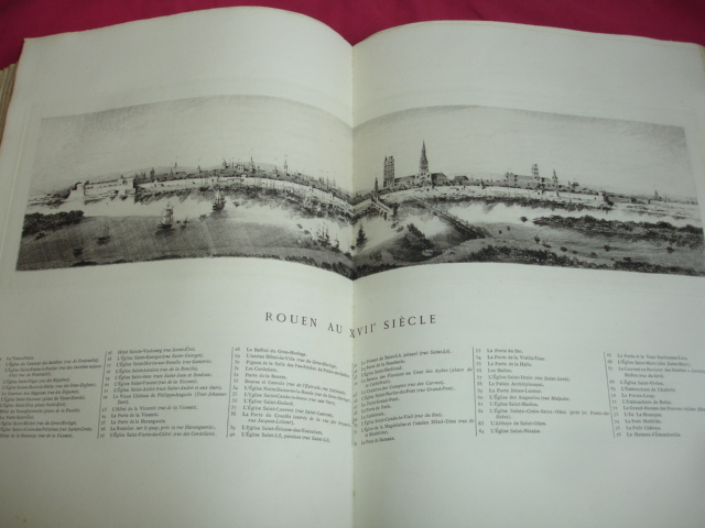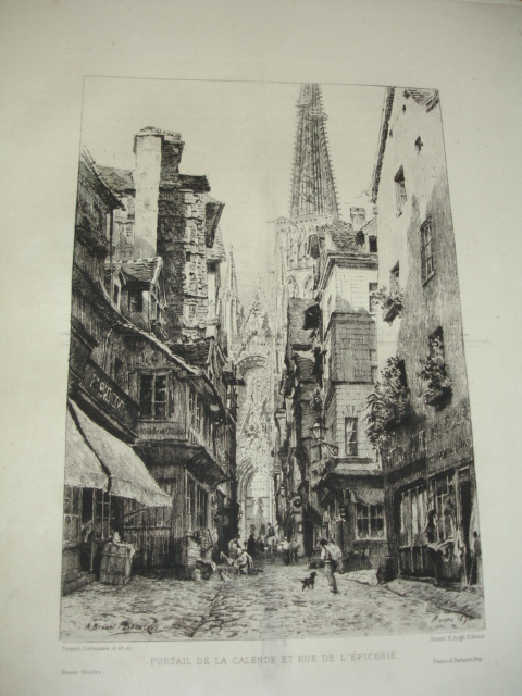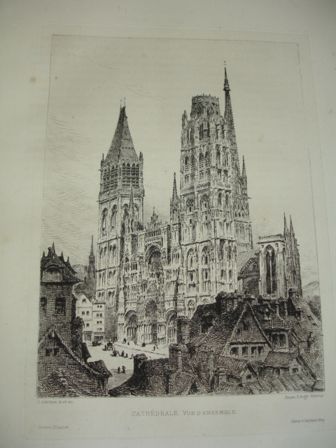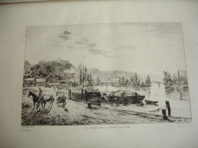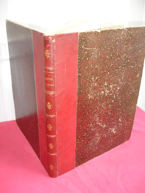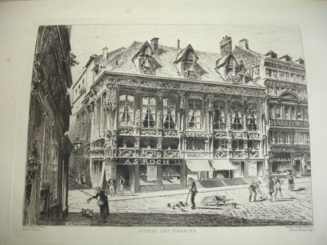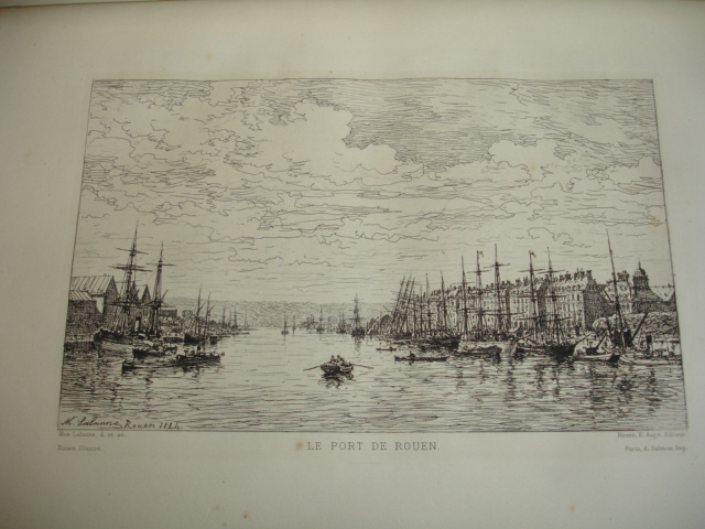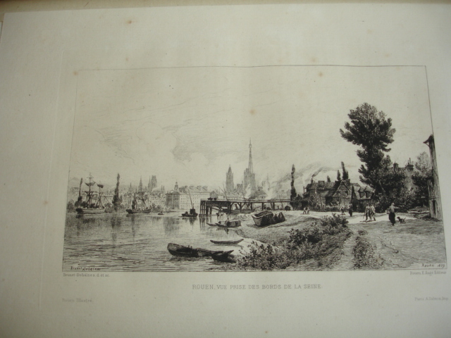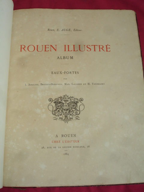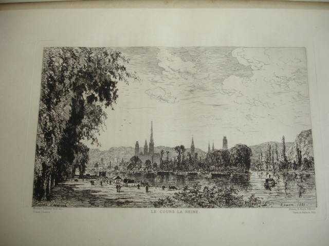 Rouen aux principales époque de son histoire jusqu'au XIXe siècle. 25 eaux-fortes montées sur onglet, de J.Adeline, Brunet Debaines, Max Lalanne et H.Toussaint vol. in-folio, 340x260, relié demi cuir, frottements en bordure, très bel état intérieur, bel exemplaire A Rouen, chez l'éditeur, 1884