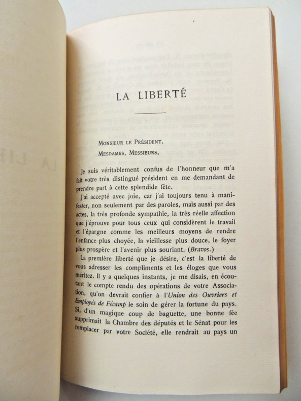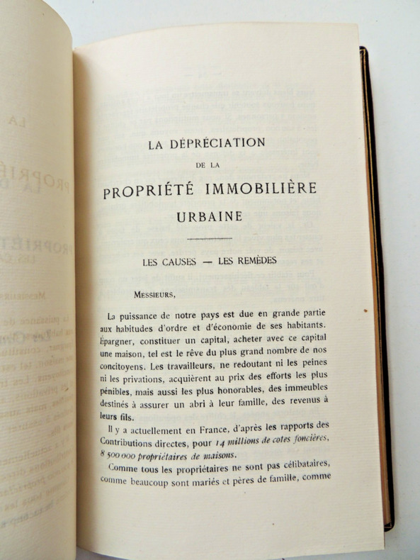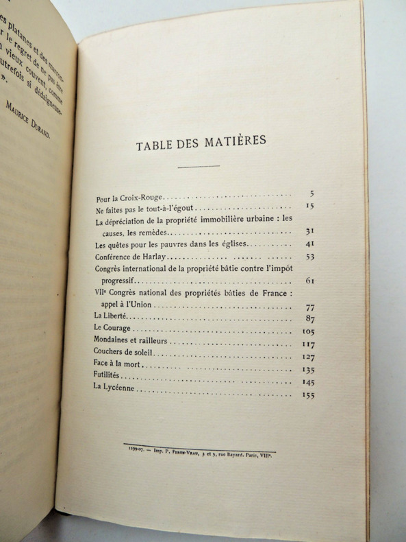 réunion de textes qui comprend; Pour la Croix Rouge - Dépréciation de la propriété immobilière urbaines, les quêtes des pauvres dans les églises, conférence de Harlay, la liberté, le courage, mondaines et railleurs, couchers de soleil, face à la mort, futilités, les lycéennes. vol relié plein maroquin marron, 21x14cm, leg. rayures d'usages, tranches dorées, très bel état intérieur, 162pp. Imprimé, Paris 1907 ref/106