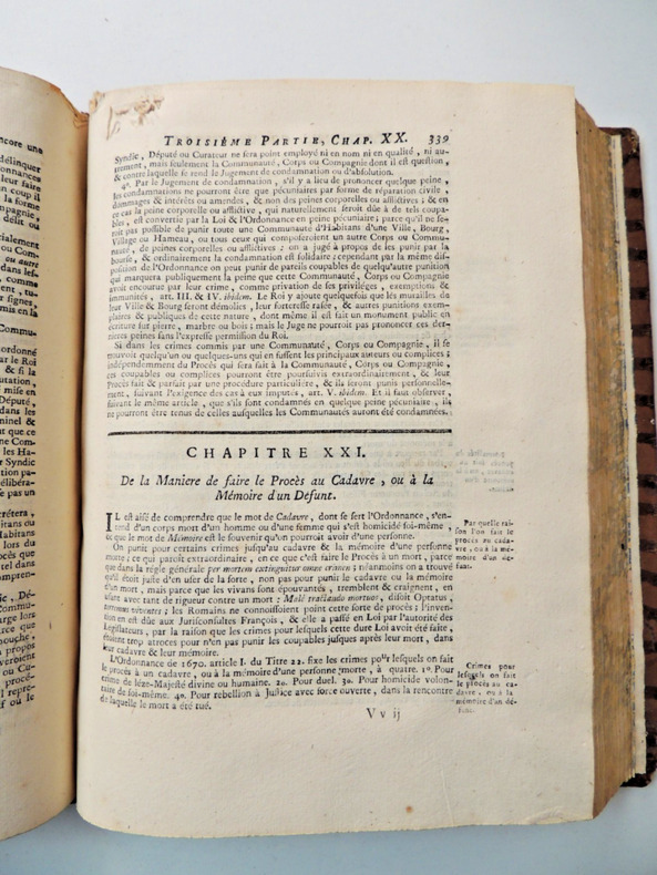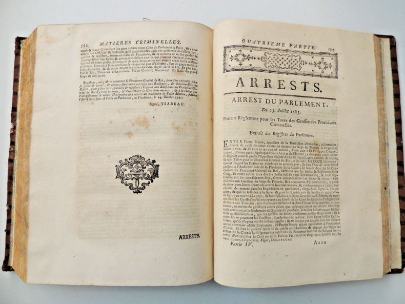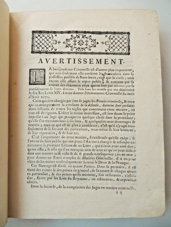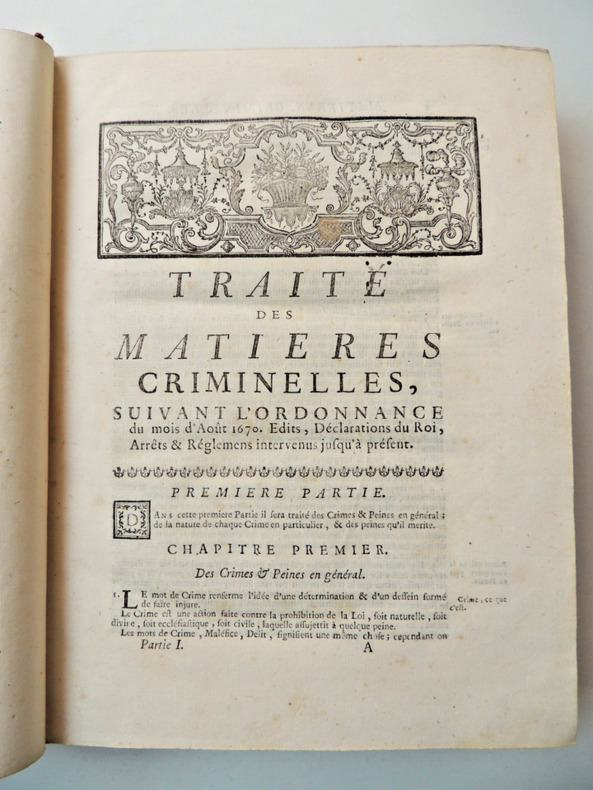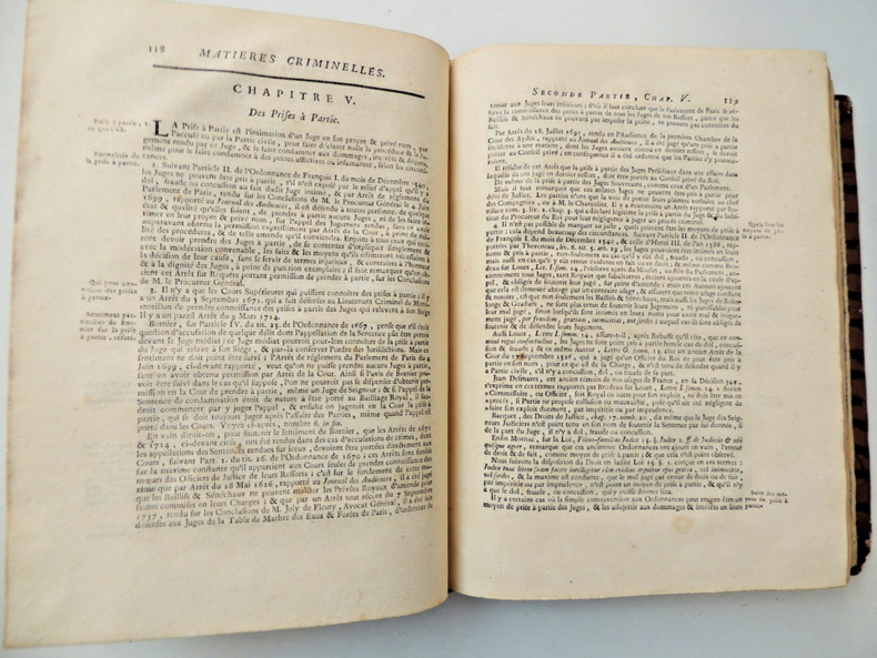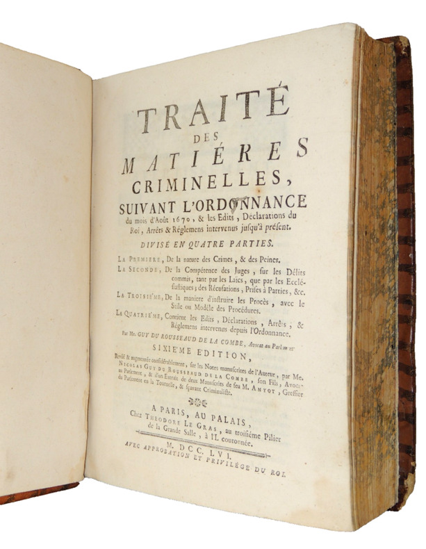 Divisé en quatre parties :La première, De la nature des Crimes, & des Peines. La seconde, De la Compétence des Juges, sur les Délits commis, tant par les Laïques, que par les Ecclésiastiques; des Récusations, Prises à Partie, etc.. La troisième, De la manière d'instruire les Procès, avec le Stile ou Modèle des Procédures.La quatrième, contient les édits, Déclarations, Arrêts, & Règlemens intervenus depuis l'Ordonnance de 1670. fort volume in4, relié basane époque, 26x20cm, épidermure, travail de vers en marge, bel état intérieur, complet, 666pp. Paris, au Palais, Théodore le Gras, 1756