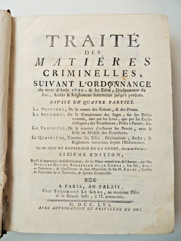 6ème édition de ce traité célèbre, qui est l'ouvrage principal de Guy du Rousseau de la Combe qui était criminaliste et avocat au parlement de Paris. Il est mort en 1749. On a imprimé dans quelques dictionnaires qu'il avait été reçu avocat en 1705. Bien écrit et présenté de manière claire et pratique, ce traité fut d'un grand usage au XVIIIe s. L'auteur traite successivement des crimes et des peines, du domaine de compétence des juges, et de la manière d'instruire un procès, avec le style ou modèle des procédures.