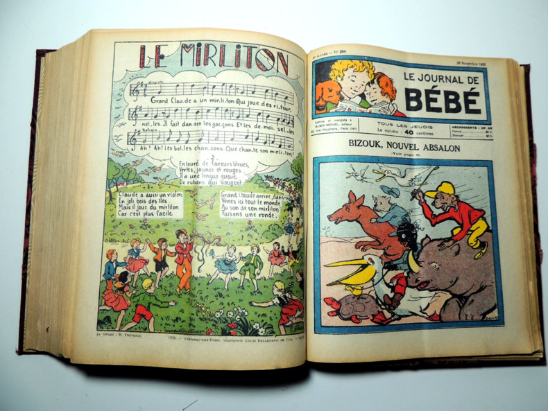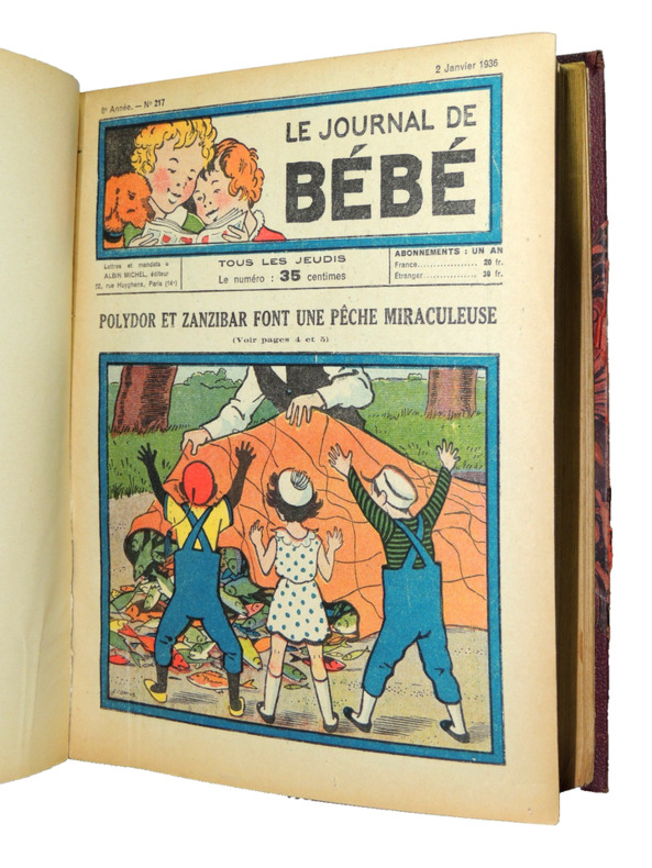 Albin Michel Le journal de bébé Journal 1936 In-8 (18.5x25.5 cm), journal agrafé, couverture illustrée en couleurs, non paginé, Le Journal de Bébé, n°256 de l'hebdomadaire paraissant le jeudi (1er octobre 1936), illustrations noir et blanc à l'intérieur, ouvrage collectif ; dos en grande partie fendu, quelques infimes déchirures en bordures, assez bon état. Livraison a domicile (La Poste) ou en Mondial Relay sur simple demande.