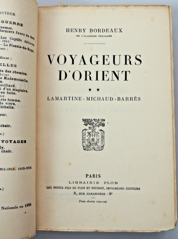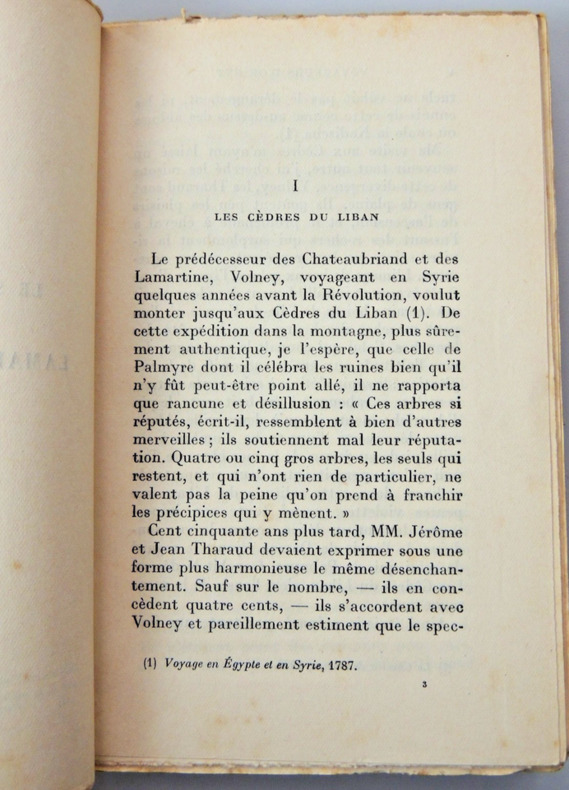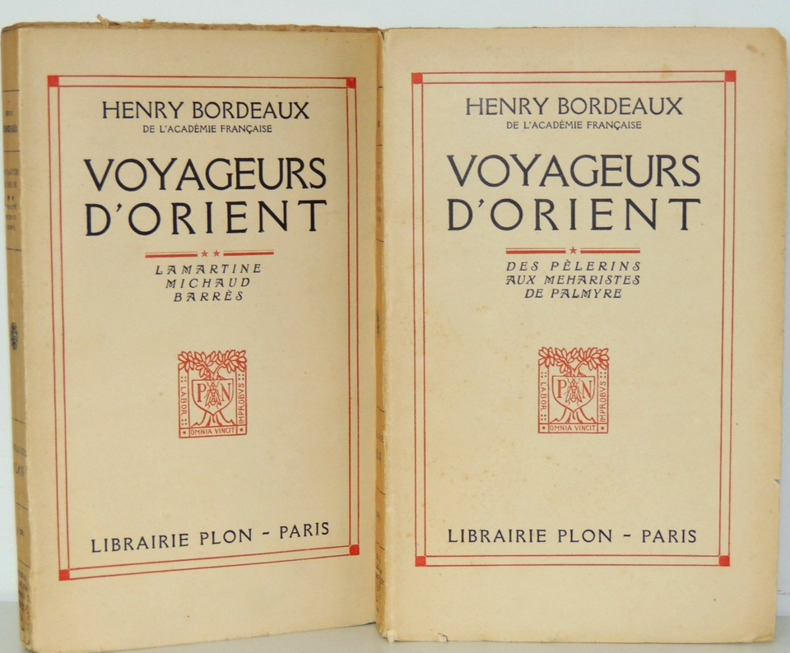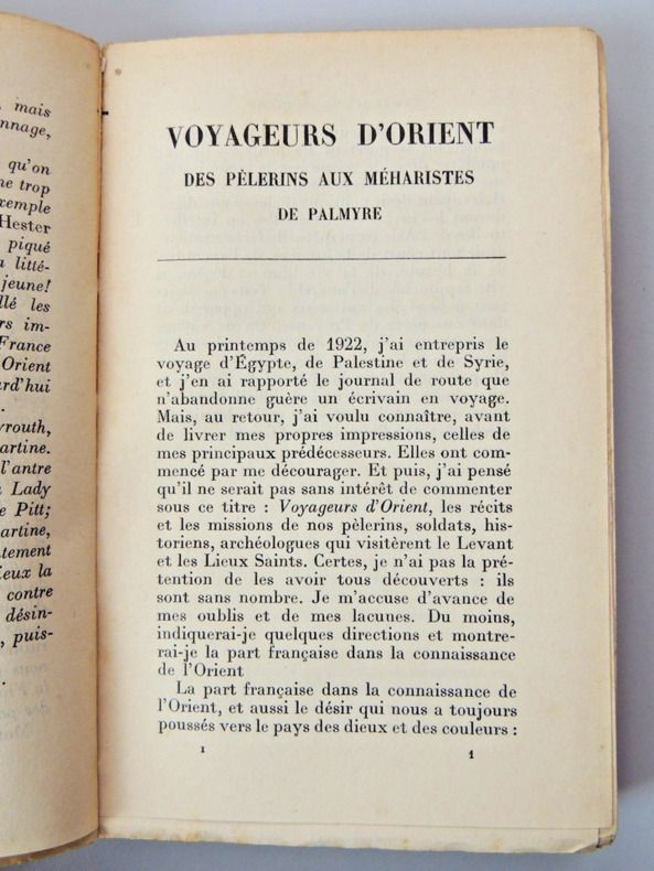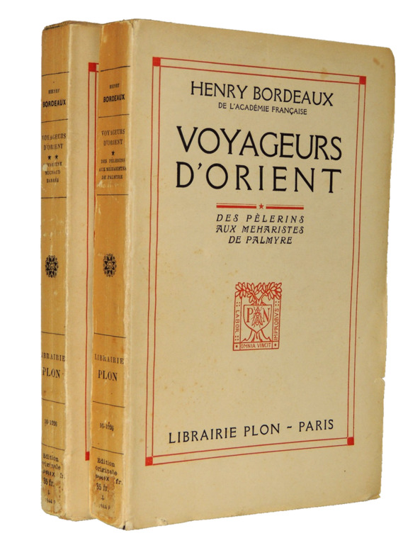 Tome I. des pèlerins aux méharistes de Palmyre, 293pp, non coupées. Exemplaires de l’Édition Originale. Tome II. Lamartine, Michaud, Barrès, 255pp Complet en deux vols brochés, 190x120, usures d'usages, bons exemplaires. Paris Plon, 1926 ref/162
