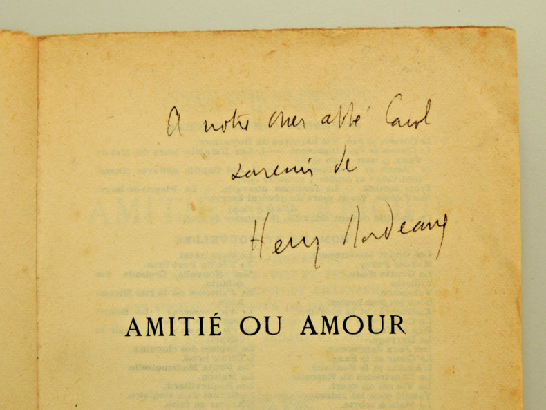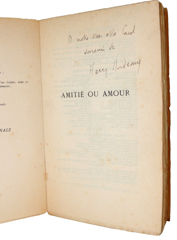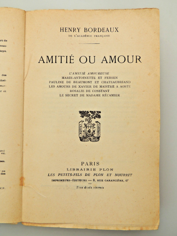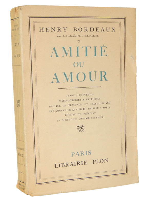 L'Amitié amoureuse. Marie-Antoinette et Fersen. Pauline de Beaumont et Chateaubriand. Les Amours de Xavier de Maistre à Aoste. Rosalie de Constant. Le Secret de Madame Récamier bel envoi autographe en page de garde à l'Abbé (?) broché, 190x120, couverture avec usure, 280pages, bon exemplaire. Exemplaire de l’Édition Originale Paris Plon 1932 ref/162