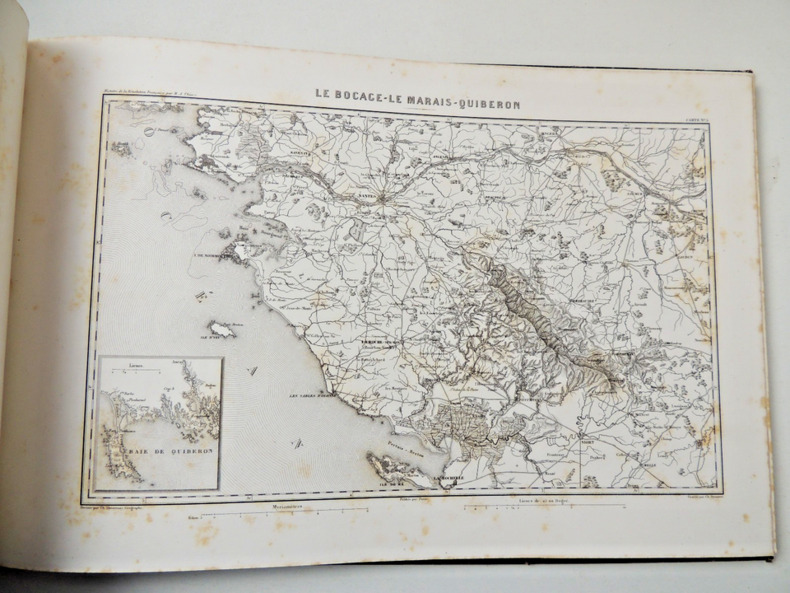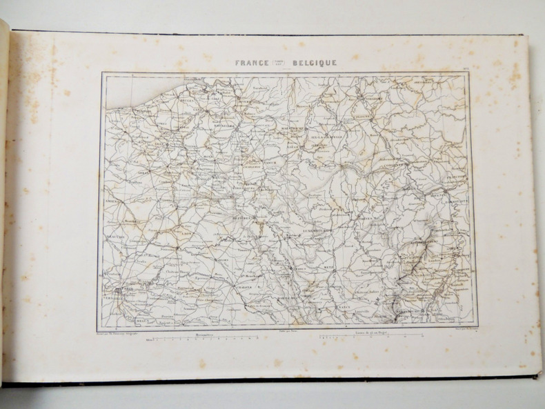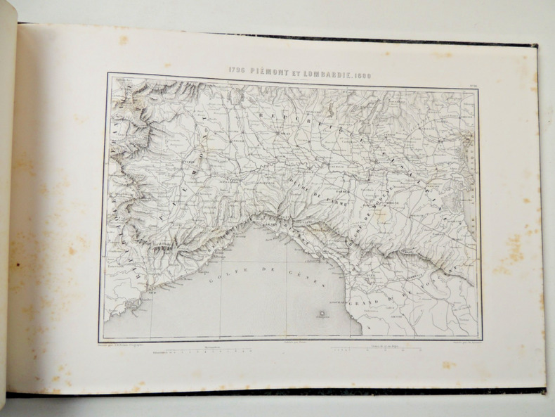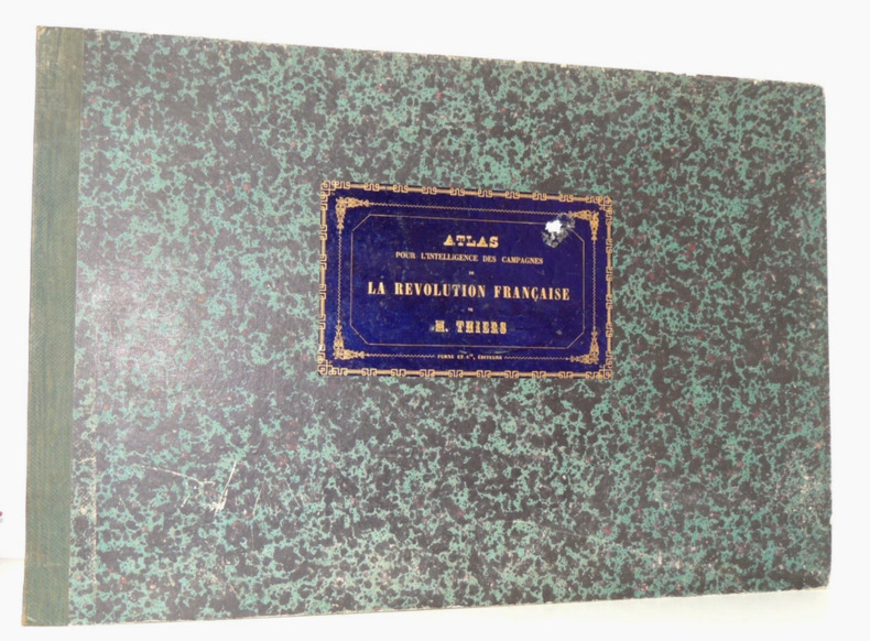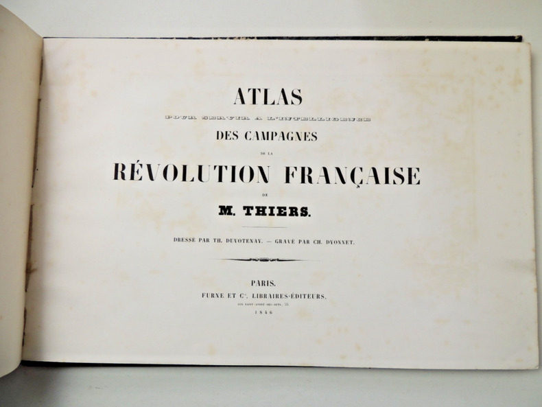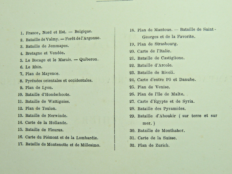 complet de ses 32 planches dressées par Th. Duvotenay - gravées par Ch. Dyonnet. Table: 1. France, Nord et Est - Belgique. 2. Bataille de Valmy - Forêt de lArgonne. 3. Bataille de Jemmapes. 4. Bretagne et Vendée. 5. Le Bocage et le Marais - Quiberon. 6. Le Rhin. 7. Plan de Mayence. 8. Pyrénées orientales et occidentales. 9. Plan de Lyon. 10. Bataille dHondschoote. 11. Bataille de Wattignies. 12. Plan de Toulon. 13. Bataille de Nerwinde. 14. Carte de la Hollande. 15. Bataille de Fleurus. 16. Carte du Piémont et de la Lombardie. 17. Bataille de Montenotte et de Millesimo. 18. Plan de Mantoue - Bataille de Saint-Georges et de La Favorite. 19. Plan de Strasbourg. 20. Carte de lItalie. 21. Bataille de Castiglione. 22. Bataille dArcole. 23. Bataille de Rivoli. 24. Entre Pô et Danube. 25. Plan de Venise. 26. Plan de lîle de Malte. 27. Carte dEgypte et de Syrie. 28. Bataille des pyramides. 29. Bataille dAboukir (sur terre et sur mer). 30. Bataille du Monthabor. 31. Carte de la Suisse. 32. Plan de Zürich volume in-4, grand format à l'Italienne, 42x28cm, cartes entières et non pliées, cartonnage éditeur Paris Furnes 1846