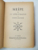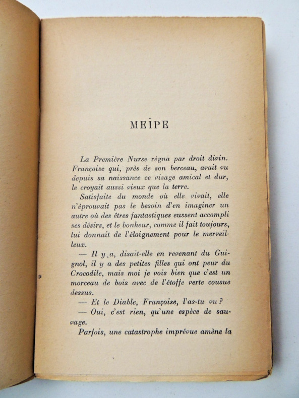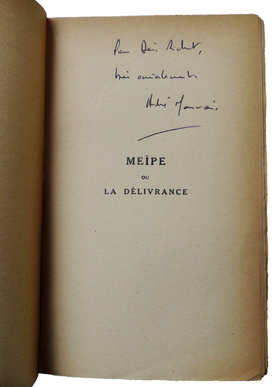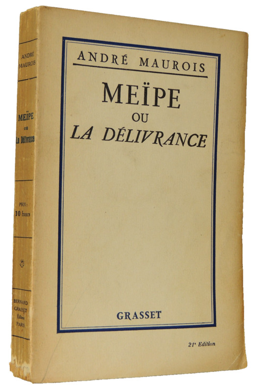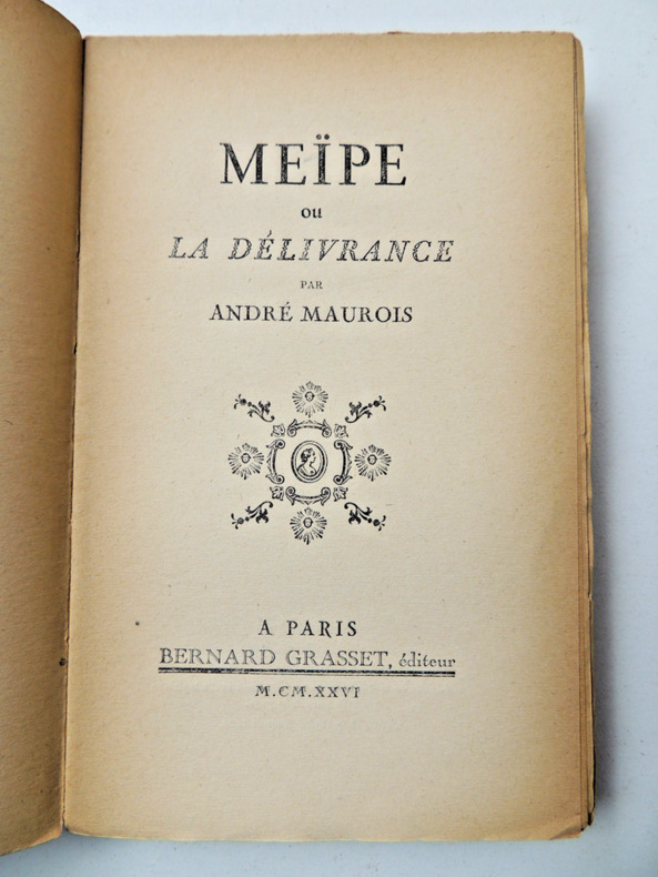 "Maurois publie, en février 1926, un recueil de nouvelles... dont le titre, Meïpe ou la délivrance, est tout entier redevable à l'imagination de Michelle [sa fille]... Meïpe, Michelle l'a inventé pour elle même et peint aux couleurs de sa fantaisie " (D. Bona. Il n'y a qu'un amour. Grasset, 2003, p. 273). Outre Meïpe, le recueil contient : "Les Souffrances du jeune Werther. Par la faute de M. de Balzac. Portrait d'une actrice". Envoi de l'auteur à sa fille : "Pour le véritable auteur de Meïpe - Affectueusement - Daddy".