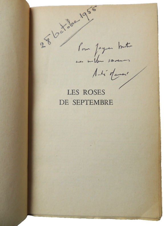 Les Roses de septembre est un roman d'André Maurois paru en 1956 chez Flammarion, évoquant les malheurs conjugaux d'un auteur vieillissant, Guillaume Fontane, séduit à nouveau par une femme beaucoup plus jeune que lui lors d'un voyage en Amérique latine vol in-8, 190x120, relié demi cuir, frottements sur les mors, dos à nerfs, tranche de tête dorée, 252 pp. Couvertures d'origines conservées, fausse mention de quarantième mille sur la couverture. Flammarion achevé d'imprimé le 1 septembre 1956. Edition originale ref/158