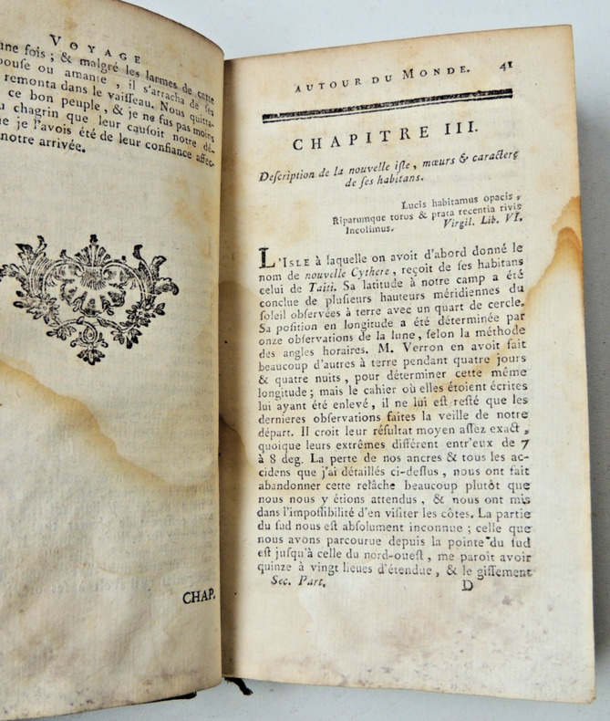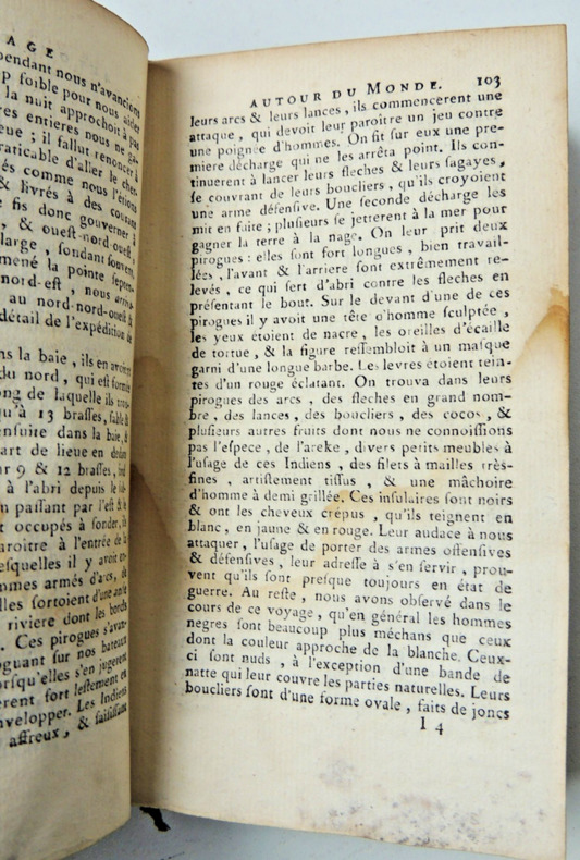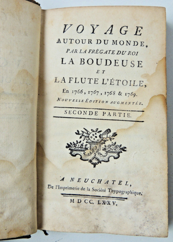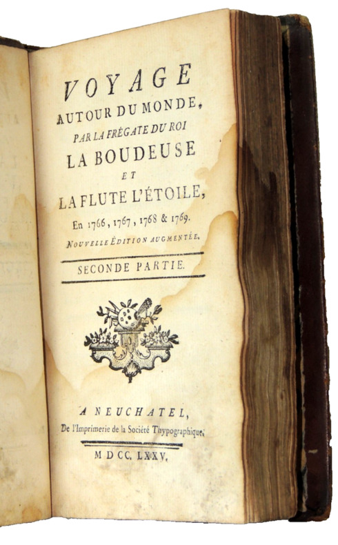 Nouvelle édition augmentée, Tome II. (Dernier). Navigation depuis le détroit de Magellan jusqu'à l'arrivée à L'Isle de Taiti, découvertes - Séjour dans l'isle, détail du bien et du mal qui nous y arrivent - description de Taiti, moeurs et caractères de ses habitants - départ de Taiti, découverte de nouvelles isles, navigation jusqu'à la sortie des isles Cyclades - navigation depuis les grandes Cyclades, découverte du golfe de la Lousianne, découvertes de nouvelles isles, relâche à la nouvelle Bretagne - navigation jusqu'au Moluques, relâche à Boreo - route jusqu'à Batavia - séjour à Batavia, détail sur les isles Moluques - route jusque l'isle de France, cap de Bonne Espérance à l'ascension et retour en France. Vol in12, relié pleine basane époque, accrocs, 17x12, bon état intérieur, traces de mouillures sèches, lisible, 242pp. Comprend un vocabulaire de l'Isle de Taiti Neuchatel, 1775 ref/BP