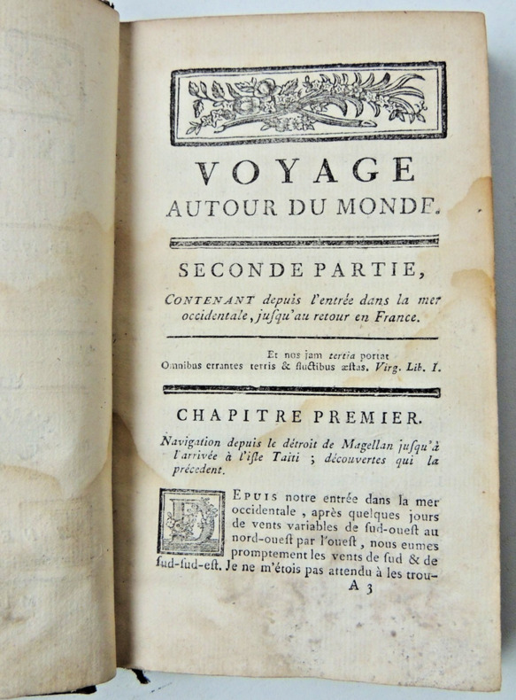 First edition of this famous circumnavigation, being the first voyage around the world with professional naturalists and geographers onboard. Bougainville was the first Frenchman to sail around the world. In 1771, Bougainville published his travel log from the expedition under the title ""Le voyage autour du monde, par la frégate La Boudeuse, et la flûte L'Étoile"". The book describes the geography, biology and anthropology of Argentina (then a Spanish colony), Patagonia, Tahiti and Indonesia (then a Dutch colony). The book was a sensation, especially the description of Tahitian society. Bougainville described it as an earthly paradise where men and women lived in blissful innocence, far from the corruption of civilisation.Bougainville's descriptions powerfully expressed the concept of the noble savage, influencing the utopian thoughts of philosophers such as Jean-Jacques Rousseau before the advent of the French Revolution. Denis Diderot's book Supplément au voyage de Bougainville retells the story of Bougainville's landing on Tahiti, narrated by an anonymous reader to one of his friends. Diderot used his fictional approach, including a description of the Tahitians as noble savages, to criticise Western ways of living and thinking.Sabin, 6864.