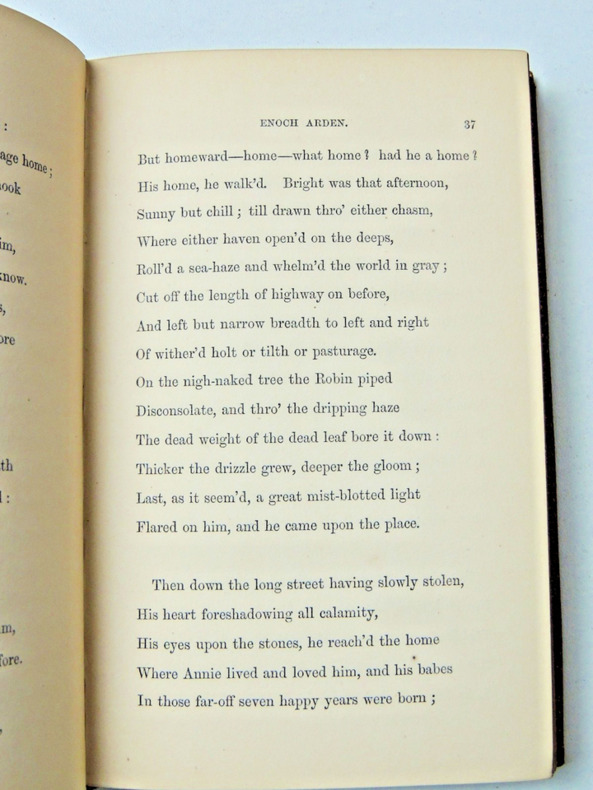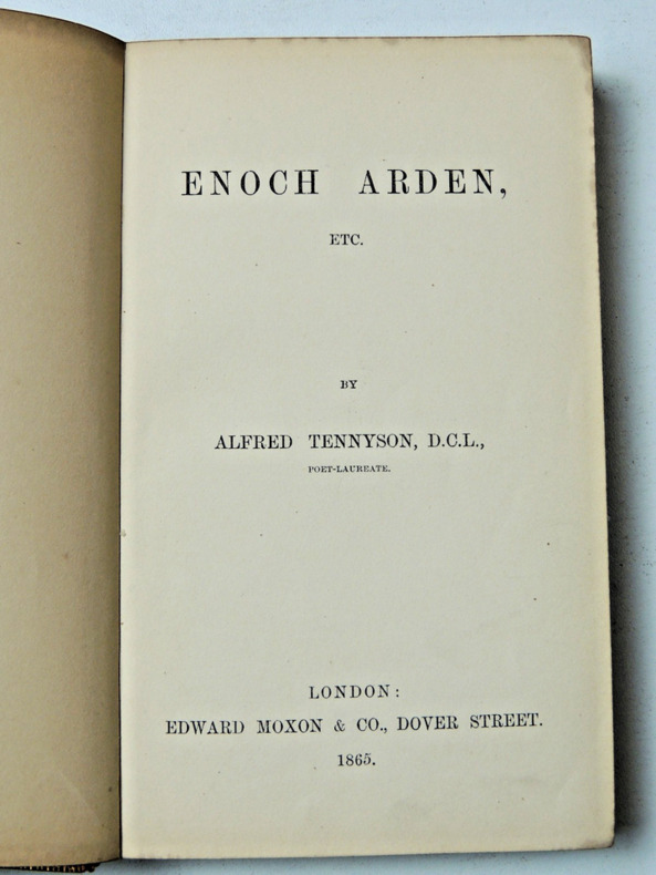 Le poème-titre, Enoch Arden, est un récit poignant sur un humble pêcheur qui, après un naufrage, passe plus d'une décennie bloqué sur une île éloignée. En rentrant chez lui, il découvre que sa femme s'est remariée avec son ami d'enfance; plutôt que de perturber son nouveau bonheur, il cache son identité et meurt en silence. Le recueil comprend également des œuvres plus courtes telles que «Aylmer’s Field», «Sea Dreams» et plusieurs poèmes lyriques, mettant en valeur la maîtrise du vers victorien de Tennyson et ses thèmes durables de l’amour, du sacrifice et de la force morale. Superbe exemplaire plein maroquin rouge, 16,5x10,5cm, leg. frottements, toutes tranches dorées, ors bien vifs, bel état intérieur, 178pp. Complet. Tampon du relieur Bickers and sun. London London, Edward Moxon, 1865 ref/22/1
