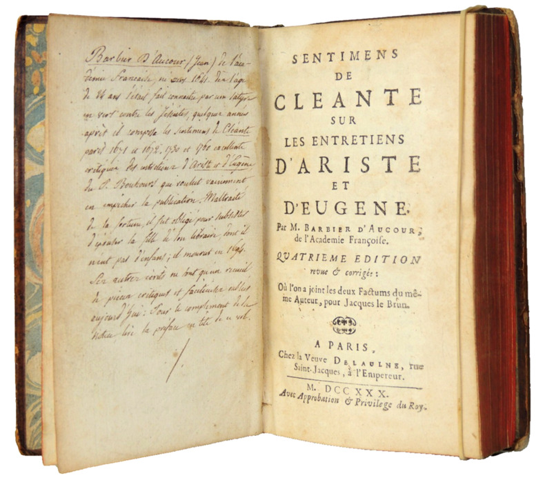 "Quatrième édition" en deux parties, l'édition définitive suivie du factum concernant une erreur judiciaire: Jacques le Brun domestique injustement accusé d'avoir assassiné sa patronne fut torturé à mort par la justice avant qu'on ne découvre le véritable coupable du meurtre, cause qui permet à l'auteur de protester avec véhémence contre l'iniquité de la justice son temps. Issu d'une famille pauvre originaire de Langres, Barbier d'Aucour devint avocat et précepteur. Louvrage prend parti pour les jansénistes sur la question de la langue française, du "bon usage" et du "bel esprit" en réfutant les 'Sentimens de Cléante' du jésuite Bouhours qui critiquait Port-Royal. "Après les 'Lettres provinciales' le seul livre polémique, dit La Harpe, qui ait assuré à son auteur une réputation qui a duré jusqu'à nous et l'ouvrage en est digne. C'est ce que la critique a produit de meilleur dans le XVIIe s. En indiquant l'erreur, il y substitue la vérité (). Il pense juste et écrit bien. Il varie son ton à proportion des objets et sa plaisanterie est fine autant que sa raison est solide et lumineuse" (Peignot, 'Manuel du bibliophile', p. 186).Très bon exemplaire, frais, bien relié à l'époque.