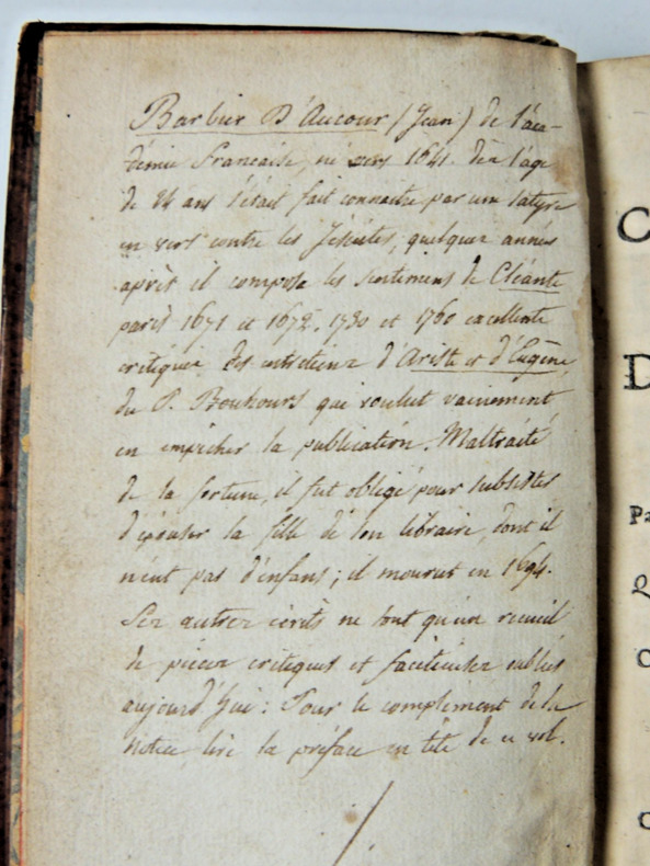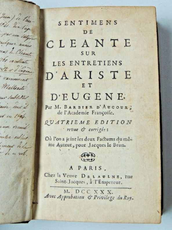Cet ouvrage est une réponse critique aux "Entretiens d'Ariste et d'Eugène" du père Bouhours, jésuite. Six entretients entre deux amis, prétexte à disserter sur la mer, la langue française, les devises... Si les entretiens sur la mer recensent les diverses opinions des Anciens, le chapitre sur la langue française établit un état de la langue orale et écrite au XVIIe, et on y trouve de nombreux renseignements sur les nouvelles expressions, les changements de mots... D'autres entretiens sont prétexte à philosopher et à l'érudition grammaticale, ainsi dans Lesw devises. Le père jésuite Bouhours fut un grammairien et un historien, on retrouve ici, sous une forme en vogue au XVIIe, une façon d'instruire par une lecture légère et agréable, et le père jésuite fut tout au long de sa vie préoccupé d'enseignement. quatrième édition, revue & corrigée, ou l'on a joint les deux factums du même auteur, pour Jacques le Brun, un domestique accusé faussement d'avoir assassiné Mme Mazel, sa maîtresse, et que Barbier d'Aucour avait défendu en tant qu'avocat. volume relié in 12, 180x100, relié pleine basane époque, accrocs, bon état intérieur, 494pp. Une page manuscrite époque en regard la page de titre A Paris, chez la Veuve Delaulne, 1730 ref/22/1