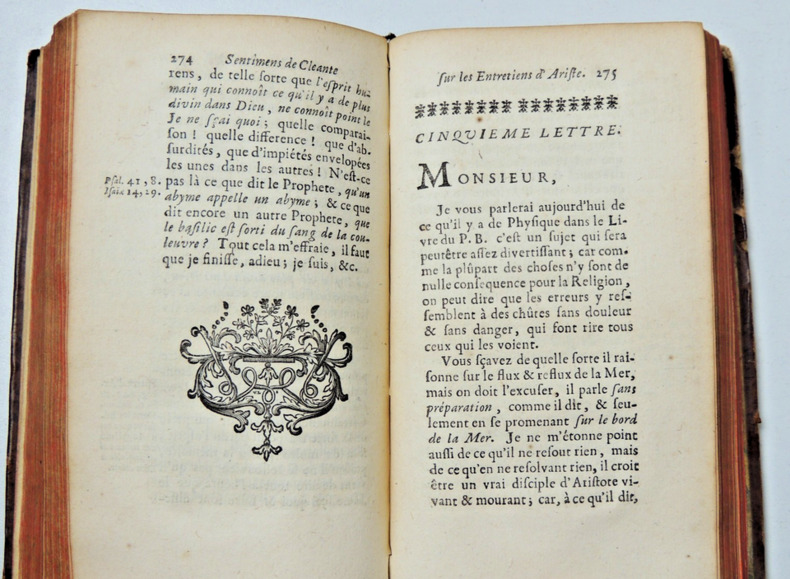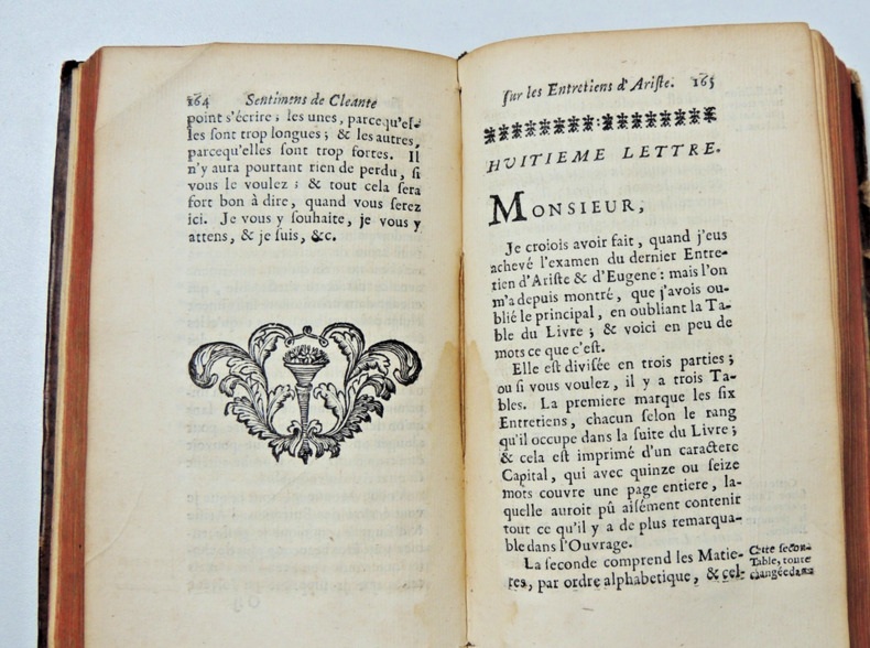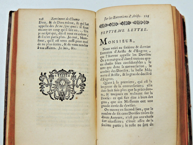 Cet ouvrage est une réponse critique aux "Entretiens d'Ariste et d'Eugène" du père Bouhours, jésuite. Six entretients entre deux amis, prétexte à disserter sur la mer, la langue française, les devises... Si les entretiens sur la mer recensent les diverses opinions des Anciens, le chapitre sur la langue française établit un état de la langue orale et écrite au XVIIe, et on y trouve de nombreux renseignements sur les nouvelles expressions, les changements de mots... D'autres entretiens sont prétexte à philosopher et à l'érudition grammaticale, ainsi dans Lesw devises. Le père jésuite Bouhours fut un grammairien et un historien, on retrouve ici, sous une forme en vogue au XVIIe, une façon d'instruire par une lecture légère et agréable, et le père jésuite fut tout au long de sa vie préoccupé d'enseignement. quatrième édition, revue & corrigée, ou l'on a joint les deux factums du même auteur, pour Jacques le Brun, un domestique accusé faussement d'avoir assassiné Mme Mazel, sa maîtresse, et que Barbier d'Aucour avait défendu en tant qu'avocat. volume relié in 12, 180x100, relié pleine basane époque, accrocs, bon état intérieur, 494pp. A Paris, chez la Veuve Delaulne, 1730I ref/32