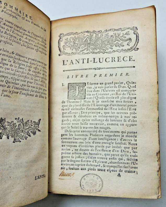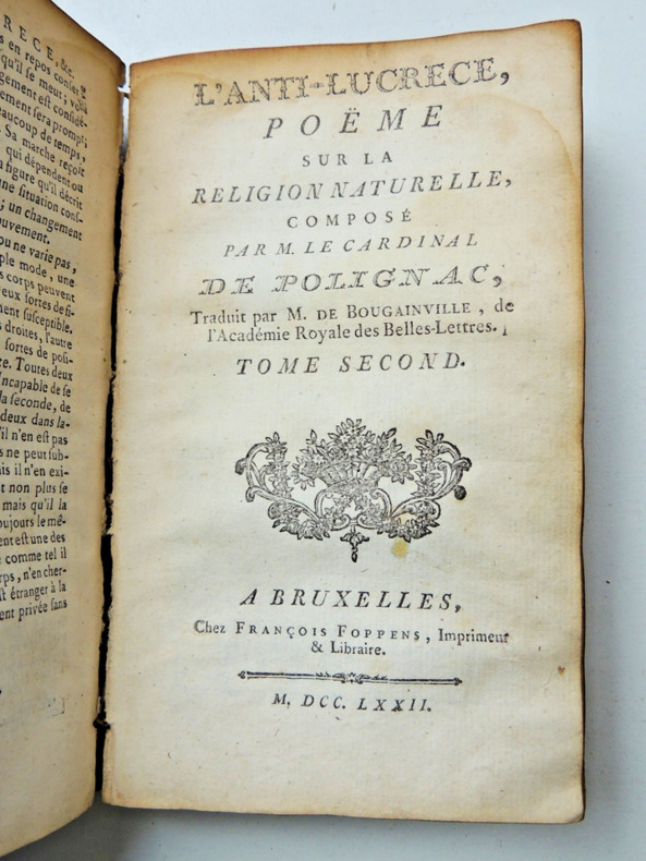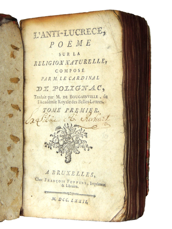 A Bruxelles, Chez Franois Foppens, imprimer & libraire, 1765-1760; in-12, 462 pp., cartonnage de l'éditeur. Bon état complet 2 tomes en 1 - reliure plein veau dos bien orné coiffe du haut pts manque plats un peu frotté coins un peu usagés sinon bel état - traduit par M. de Bougainville, de l'académie royale des belles-lettresAdversaire de l"athéïsme contemporain et du système d"Épicure maître de Lucrèce, Polignac, en ardent défenseur de Descartes, fait ici sienne la preuve de l"existence de Dieu et de l"immortalité de l"âme. Cette édition bruxelloise Cette traduction de Jean-Pierre de Bougainville fut publiée d"abord en 1749. Ce poème philosophique fut composé par le cardinal à la suite d"une dispute avec Bayle. L"ecclésiastique y réfute le ""De natura rerum"", de Lucrèce sur lequel s"appuyait Bayle pour justifier son scepticisme, et développe quelques théories de Descartes sur l"univers et le machinisme. L"ouvrage, resté inachevé à la mort de l"auteur, fut complété par l"abbé Rothelin et le professeur Lebeau. :: Les deux tomes sont à pagination continue mais avec pages de titre séparées.